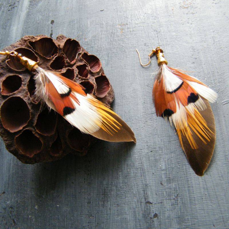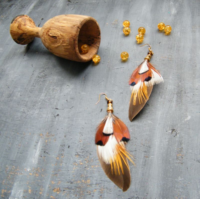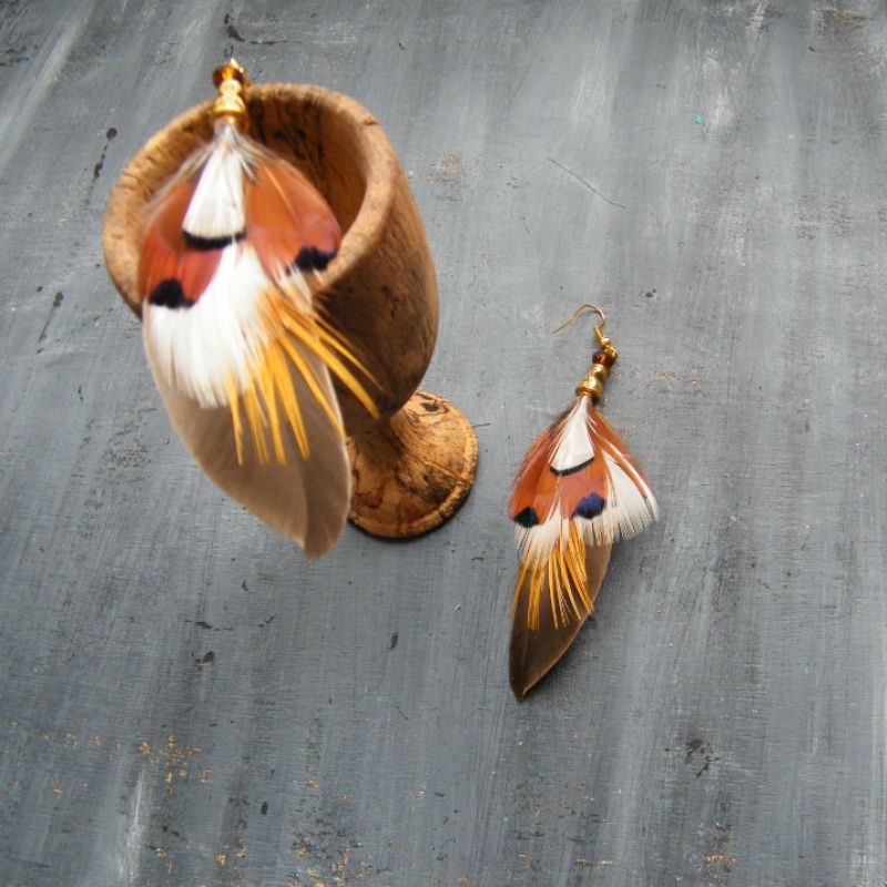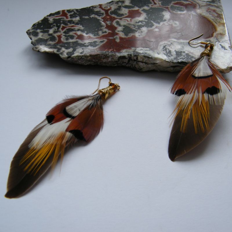 Серьги с перьями Художник - Природа созданные с перьев алмазного и охотничьего фазанов и утки. Все перья натуральной окраски и с живой птицы (линька). Украшенные стеклянными хрустальными бусинами и металлической фурнитурой «золото». Изысканные серьги для ценителей стиля Бохо. Подойдут к любому событию. Размер: ширина - 3 см., Длина - 9 см.