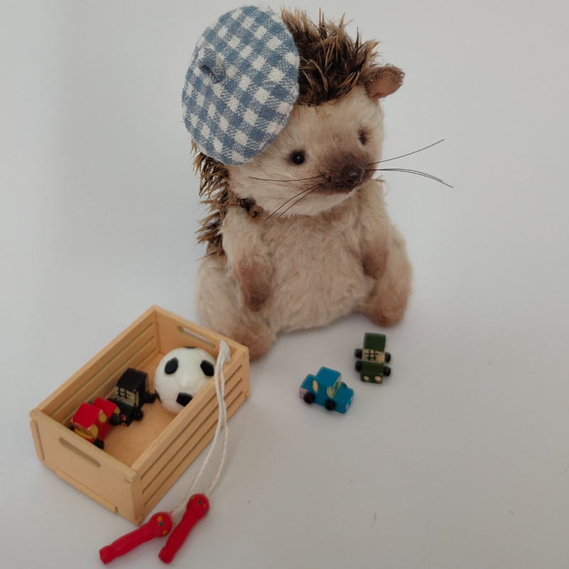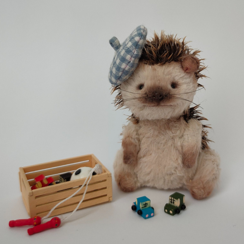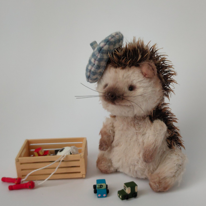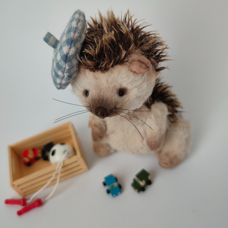 Їжачок виготовлений з італійської віскози та їжачкового мохеру. Всередині має тирсу та трохи стального грануляту для обтяження. Тонований сухою пастеллю. Очі скляні, ніс зліплений вручну з самозастигаючого епоксидного пластиліну. Лапки та голова рухомі. Рост 8 см., тільки сидить.