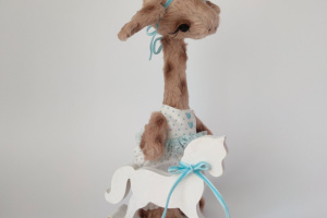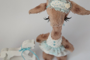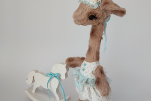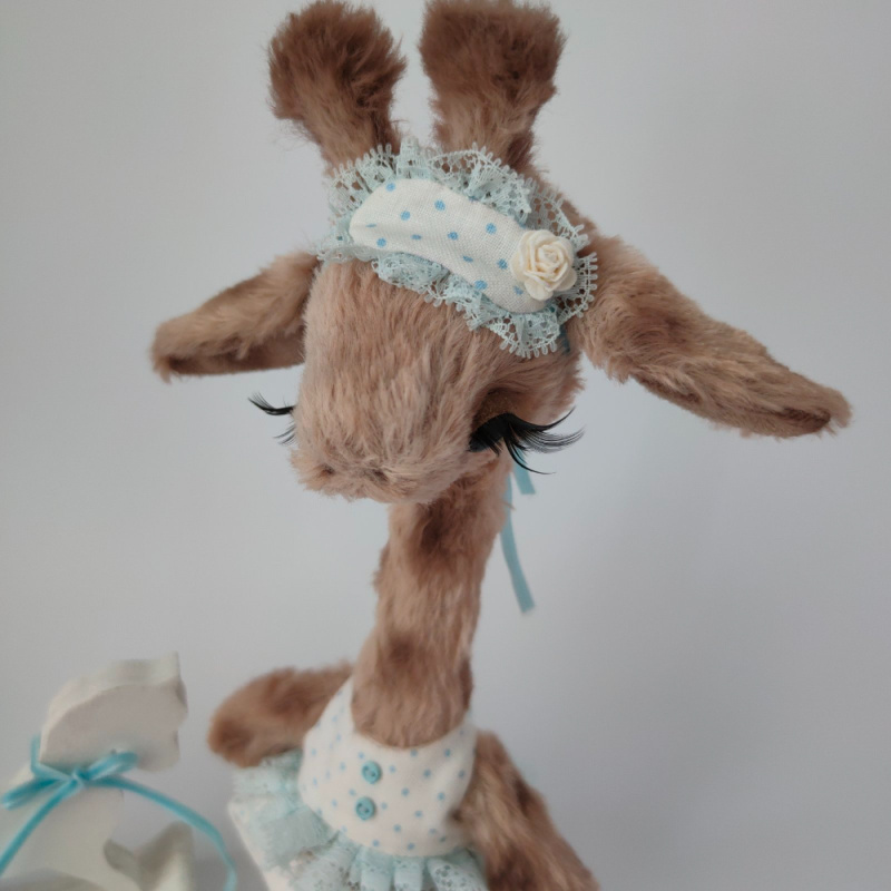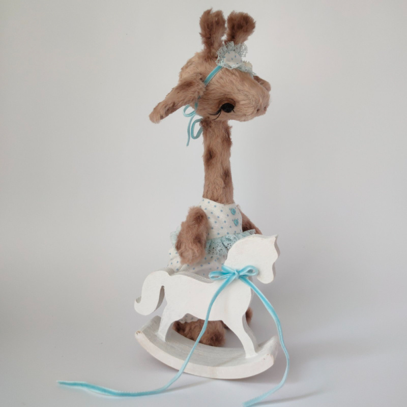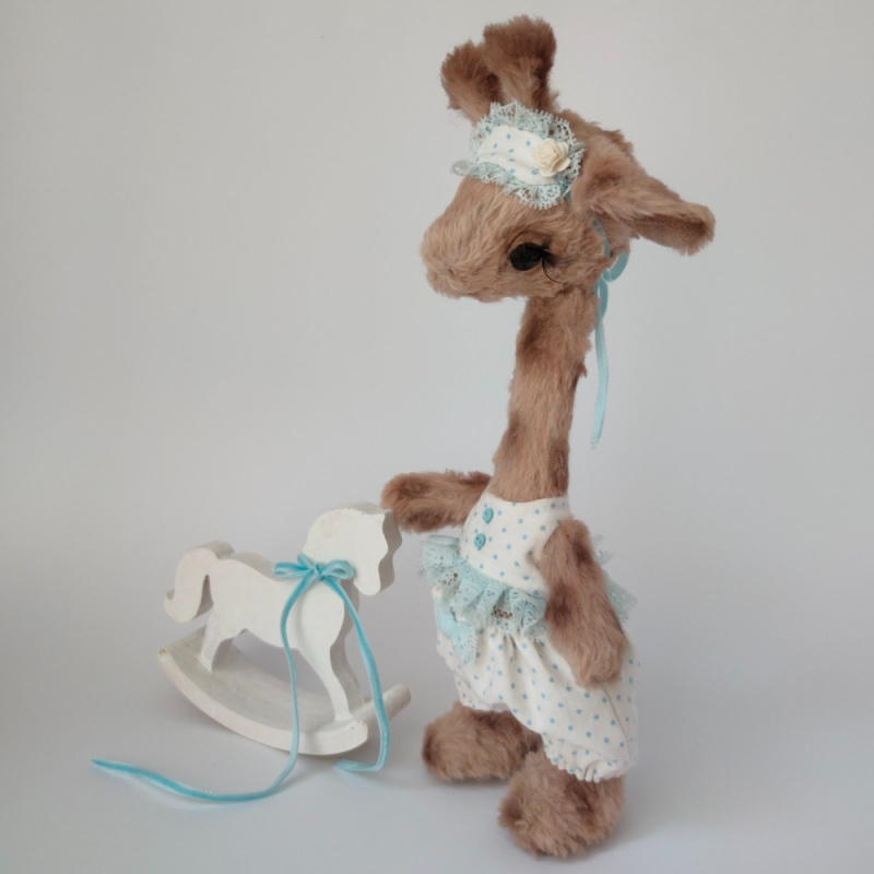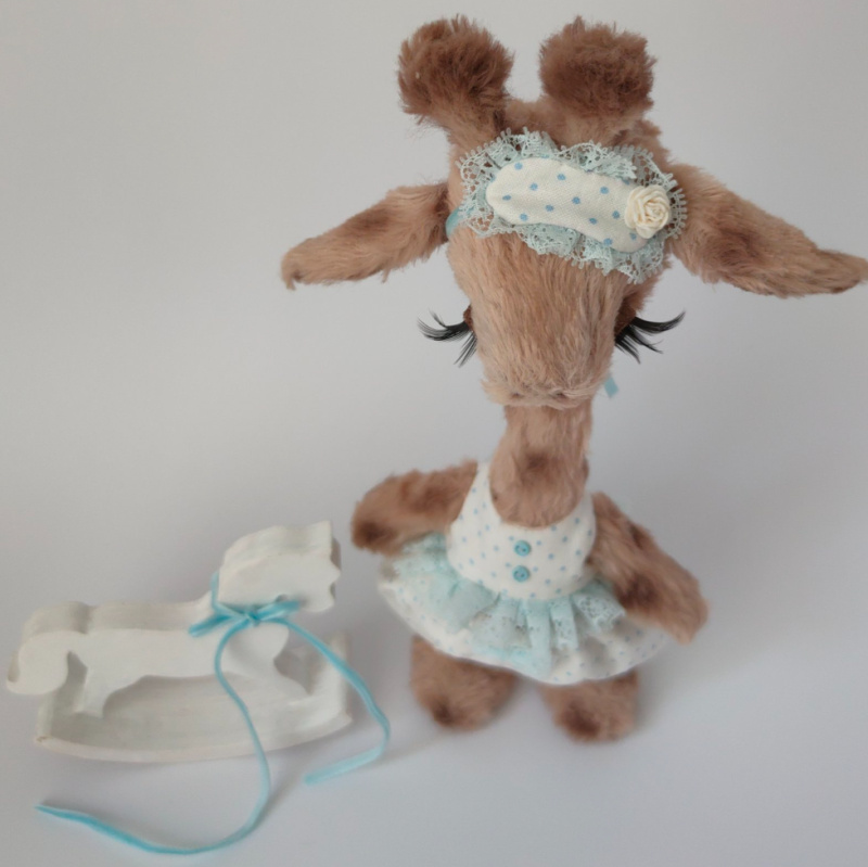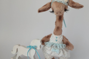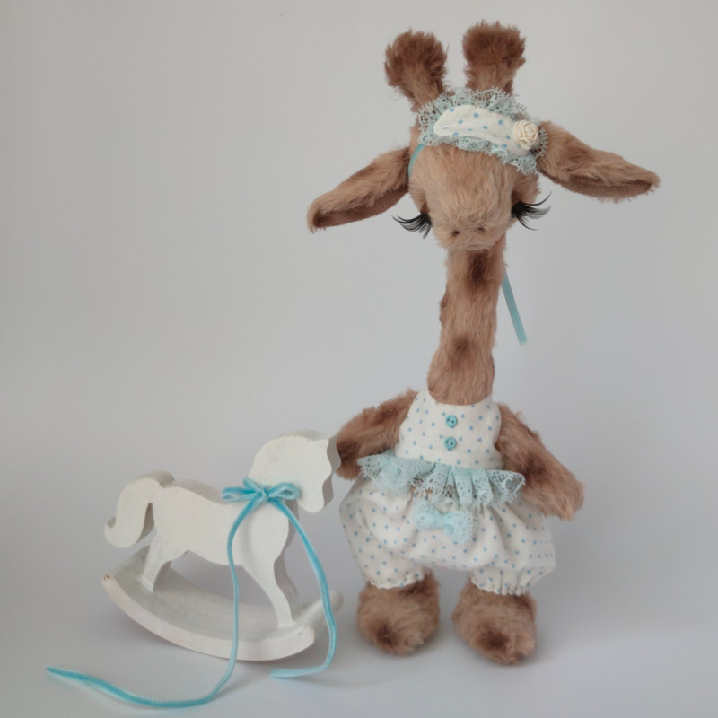 Дівчинка виготовлена з німецької віскози. Всередині має тирсу, гіпоалергенній штучний наповнювач та трохи стального грануляту для обтяження. Тонована сухою пастеллю. Очі скляні. Лапки та голова рухомі. Ростом 25 см. Одяг знімається.