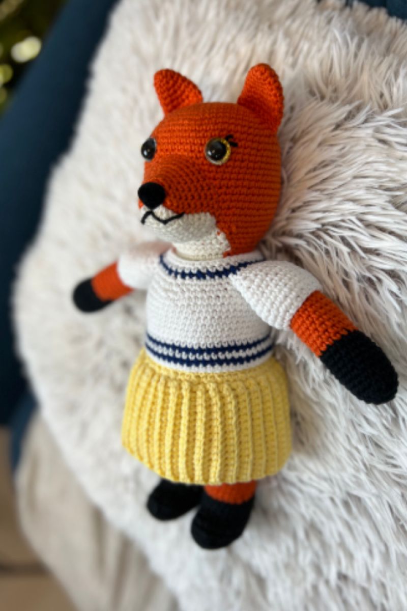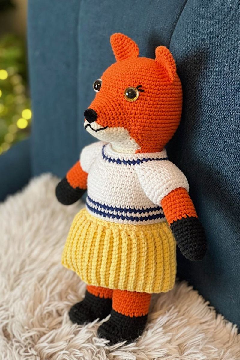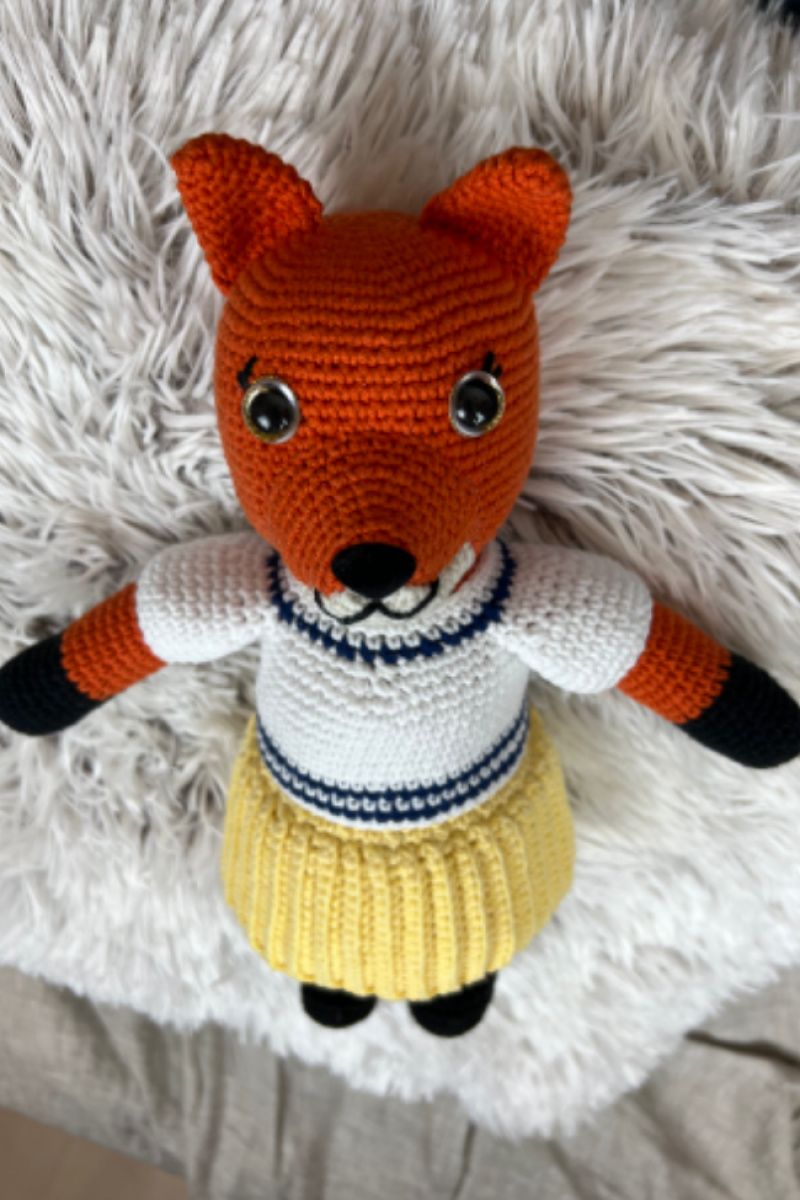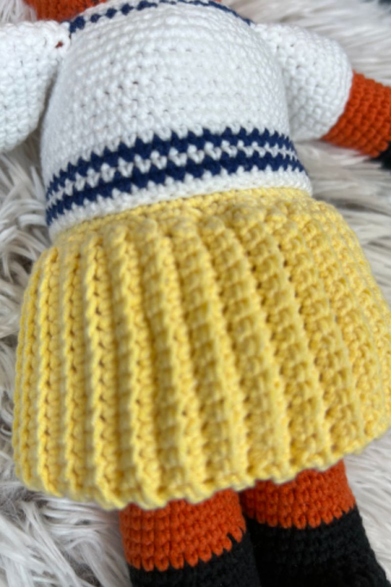 Игрушка ручной работы, связанная крючком, наполнена холофайбером. Пряжа полухлопчатобумажная. Гипоаллергенная, стойкая. Безопасна для ребенка. Глаза и носик на безопасном креплении. Блузочка и юбочка снимаются.