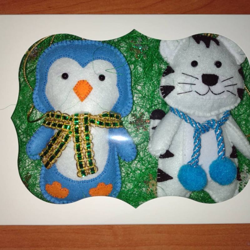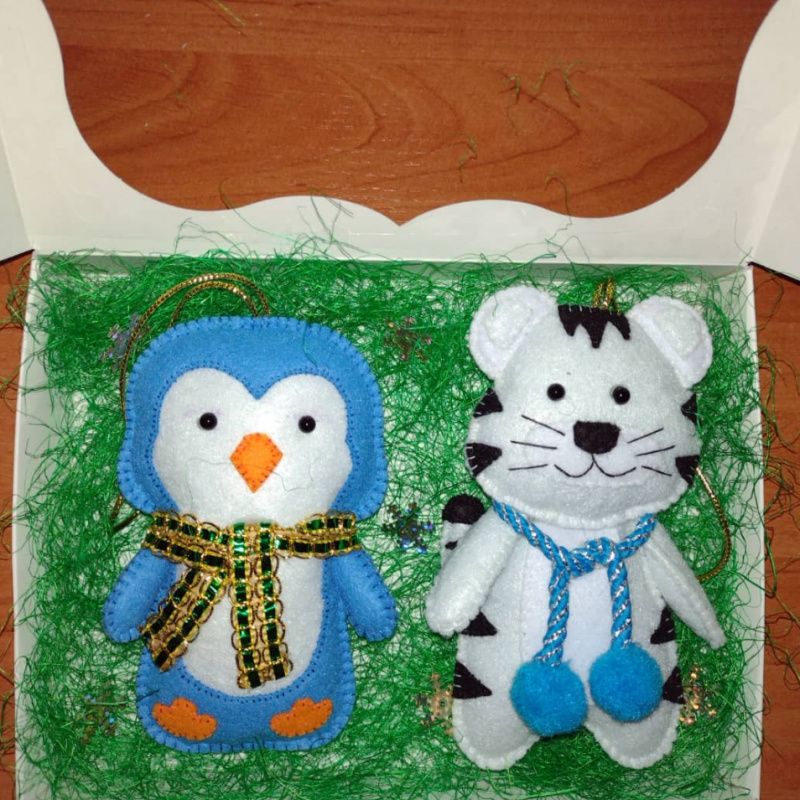 Игрушки на ёлку. Сделаны из фетра наполнитель холлофайбер. Размер пингвина 13×8, тигр 14×9
