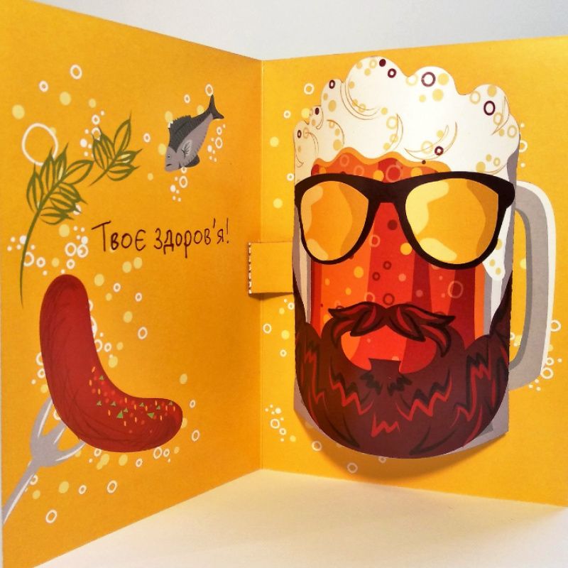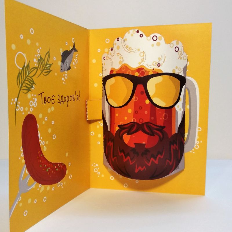 Класнюча 3Д открытка, в которой наш иллюстратор оживил бокал пива. При открывании открытки кружку пива приобретает объем. Вау эффект гарантирован, открытку хочется открывать еще и еще)))