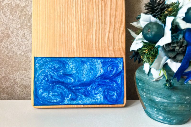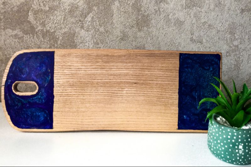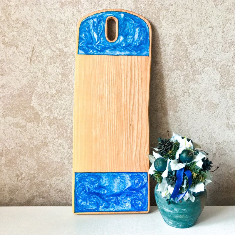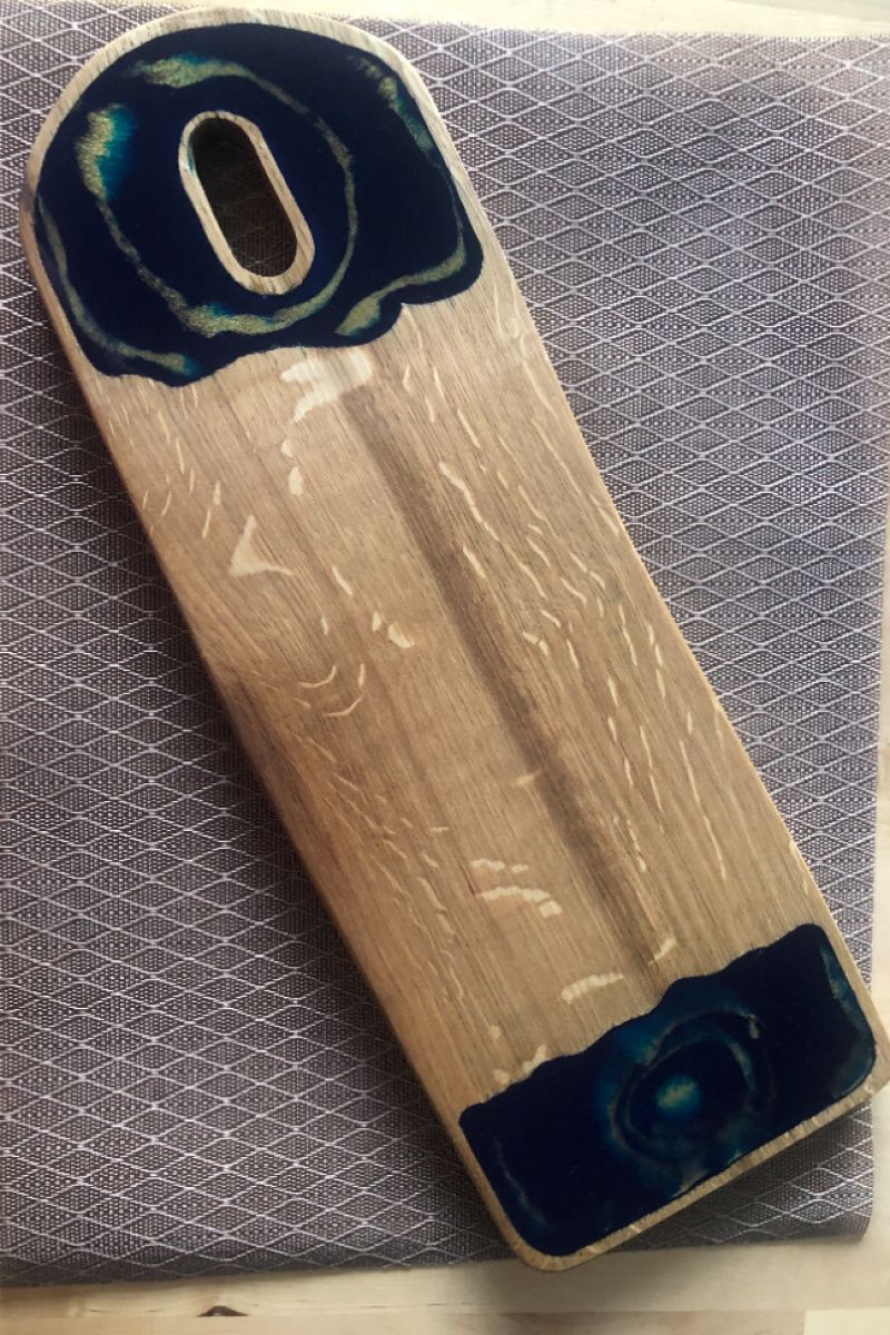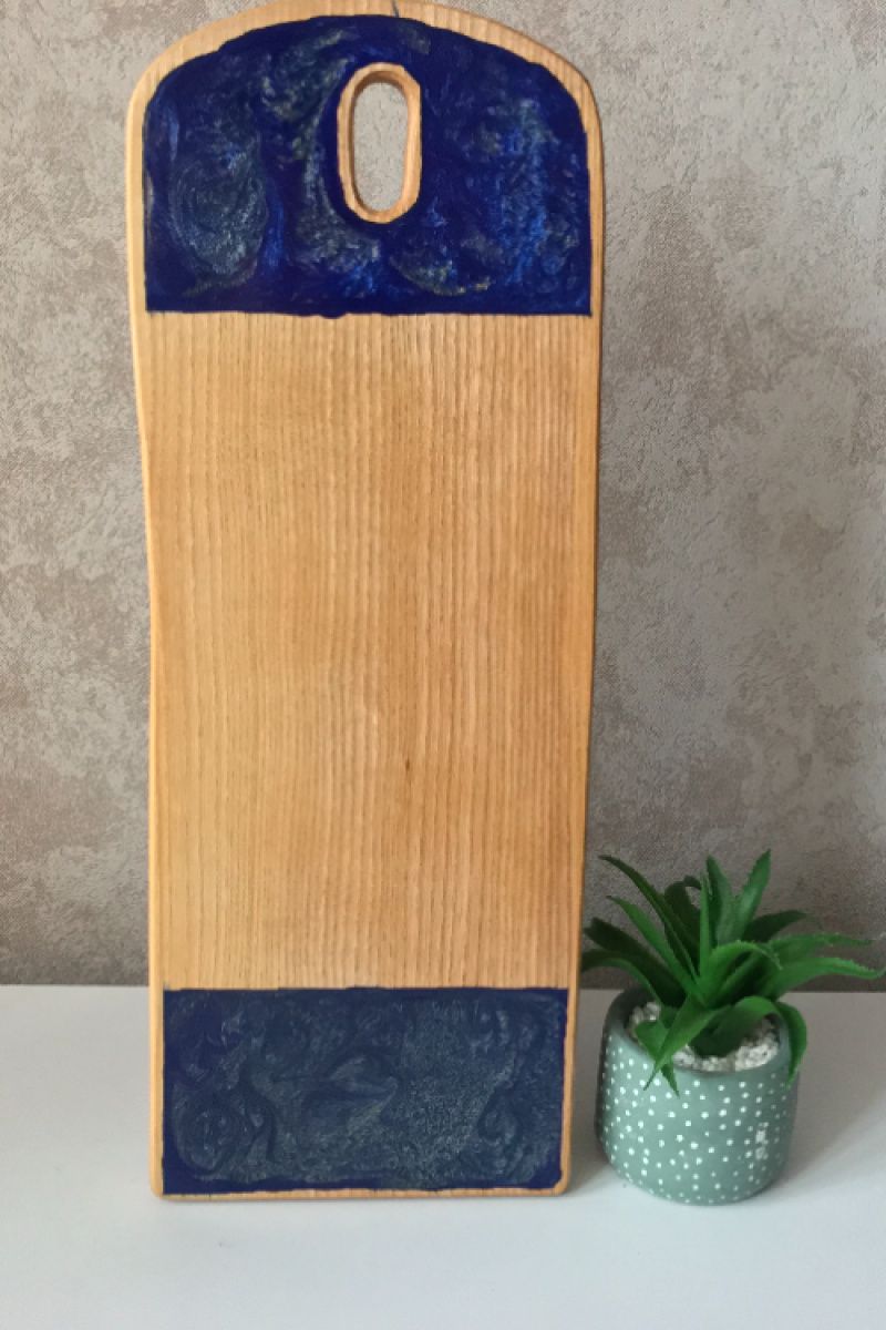 Совершенно новая доска в различной цветовой гамме. Главная задача в данном проекте это совмещение таких параметров, как габариты и внешний вид. Причем для нарезки и отбивание мяса можно использовать не только лицевую, но и заднею сторону, где нет смолы вообще. Данная доска — это отличный внешний вид и надежность. Совмещение стандартного и перламутрового цвета это нечто, с учетом возможности подбора под кухню — это идеальное решение. Мы решили пойти дальше, чем наши конкуренты и уделили особое внимание мелочам. Во-первых, наши доски — это цельный элемент ясеня, а не какая-нибудь клееная сосна. Во –вторых: скруглены по всему периметру, что улучшает эстетический вид. Заливка сделана не насквозь поскольку это не надежно в плане использования. Изделие уже покрыто специальным маслом и готово к использованию. Отправка доски осуществляется в нестандартной коробке, с наполнителем идеален вариант, если вы покупаете часы на подарок. Забрали на почте – подарили. Теперь не нужно отдельно покупать подарок, потом стоять в очередях, для его упаковки! Можем изготовить на заказ любой цвет, форма, размеры.