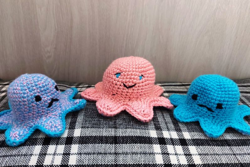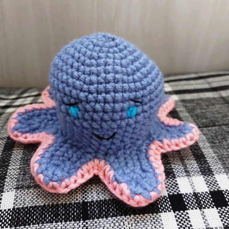 Мягкая игрушка осьминог-перевертыш двусторонний. С одной стороный осьминог улыбчивый, со второй стороны сердитый. Двухцветная мягкая игрушка осьминог мягкая и приятная на ощупь, легко выворачивается за несколько движений.