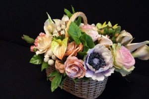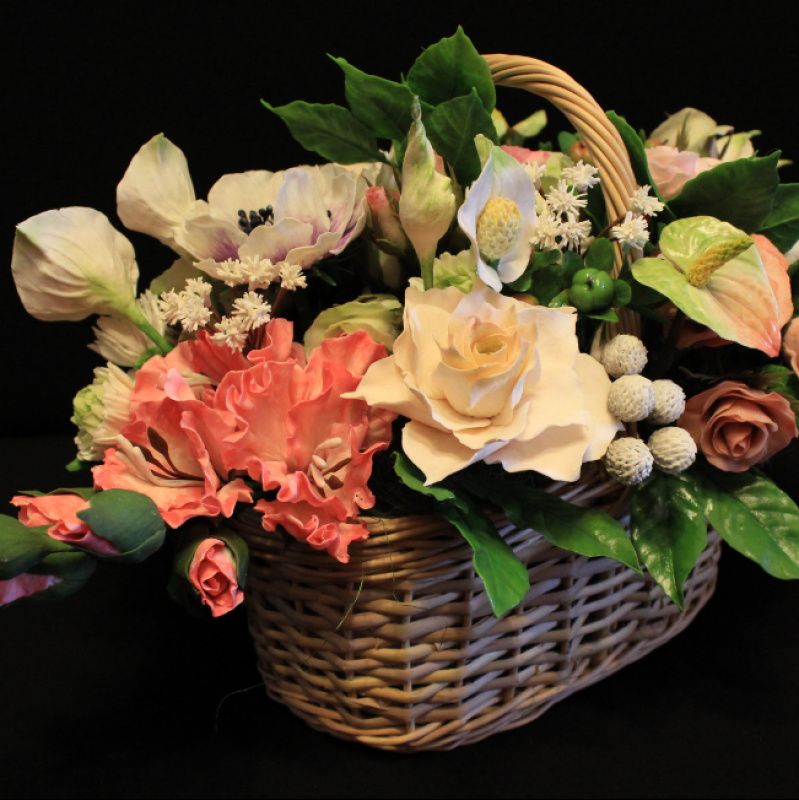 В составе: гладиолус, каллы, спатифилум, антуриум, анемоны, бруния, гардения, ягоды гиперикума, хризантемы, гипсофила, листья розы, фикуса.