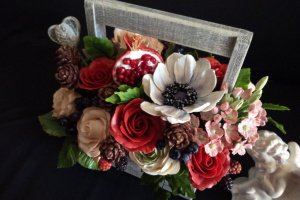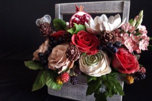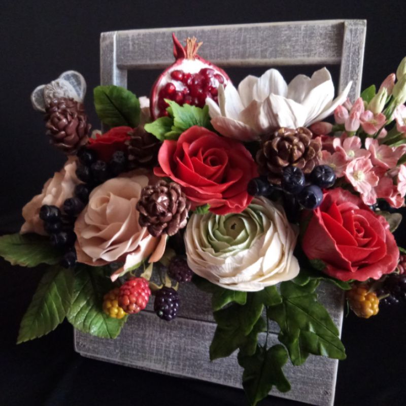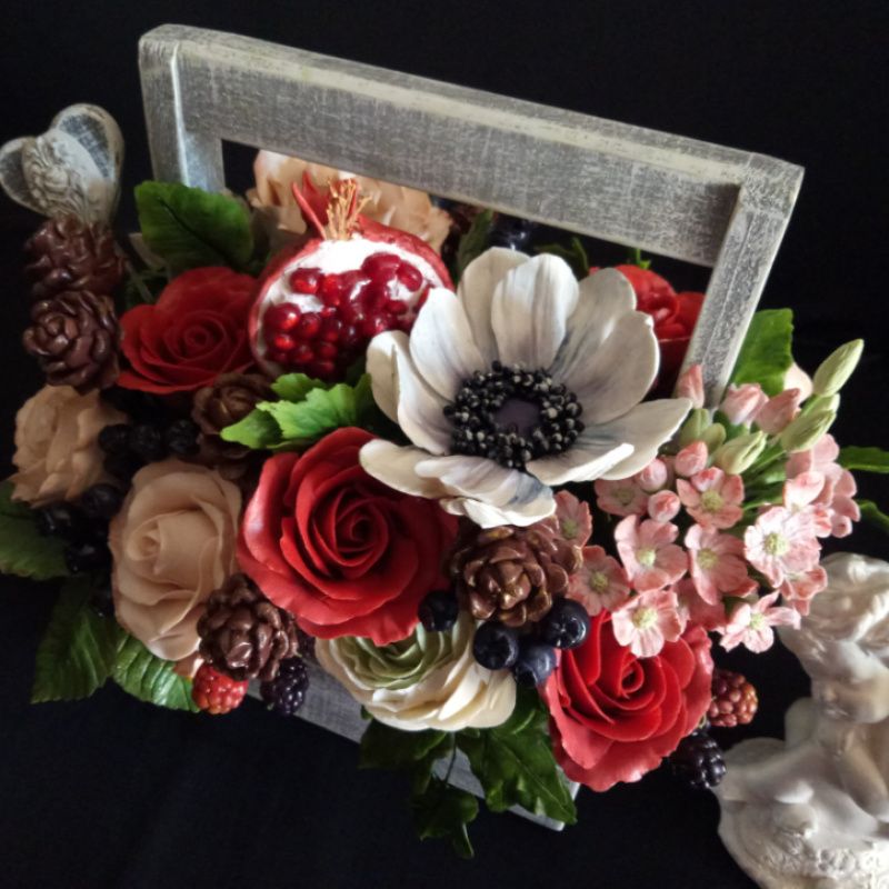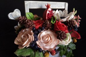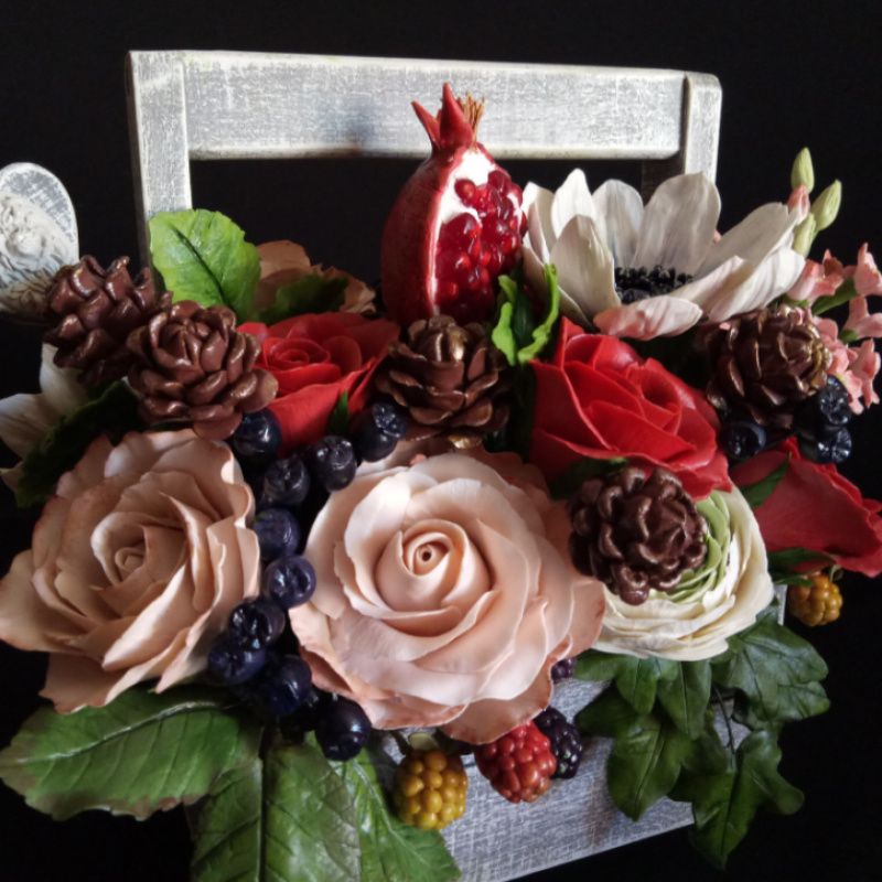 В составе: гранат, красные и розовые садовые розы, анемоны, ранункулюсы, ягоды ежевики и черники, листья розы и плюща.