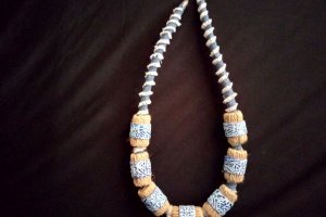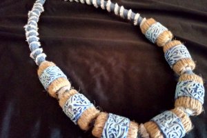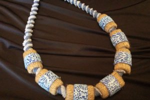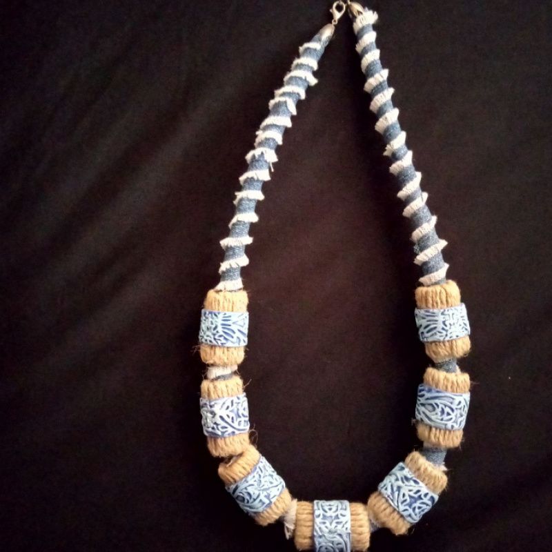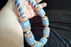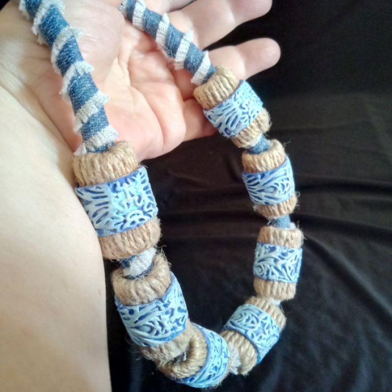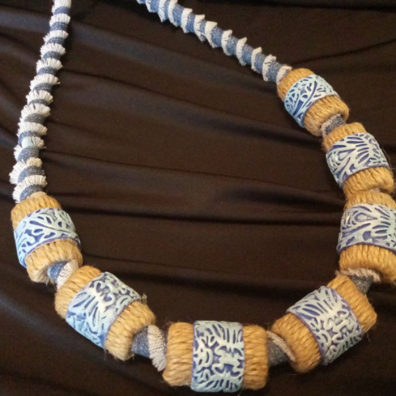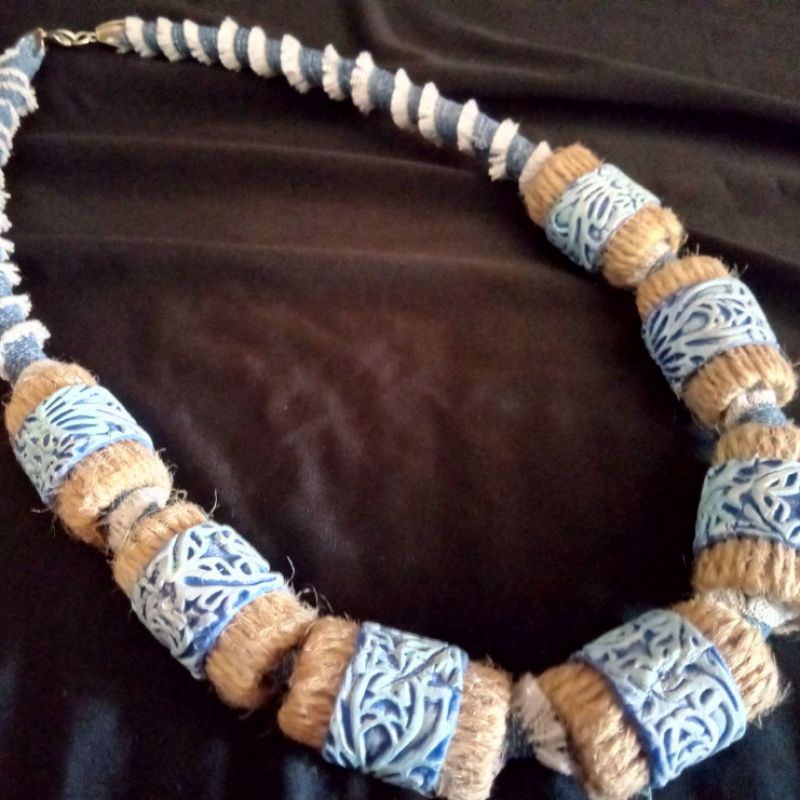 Колье в смешанной технике. Бусины из джута на твёрдой основе, покрытый полосками из тиснённого холодного фарфора