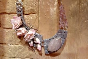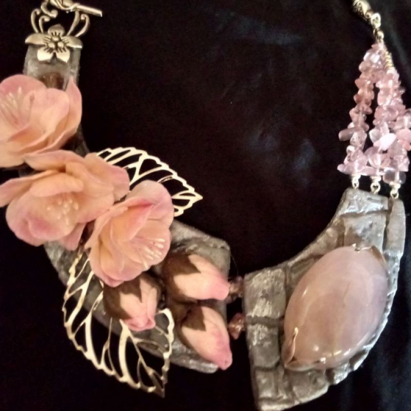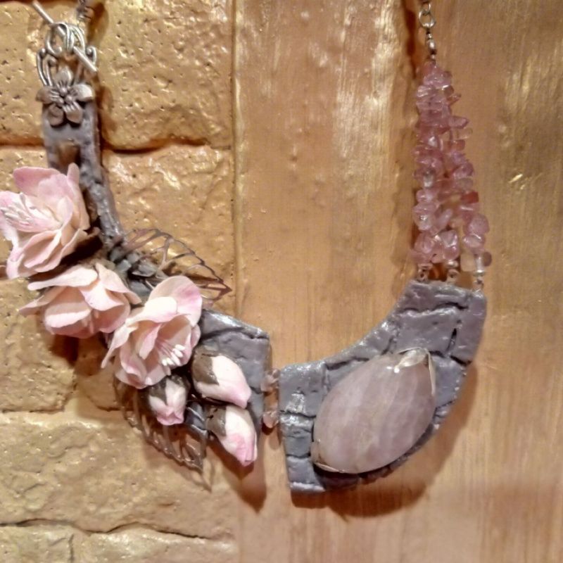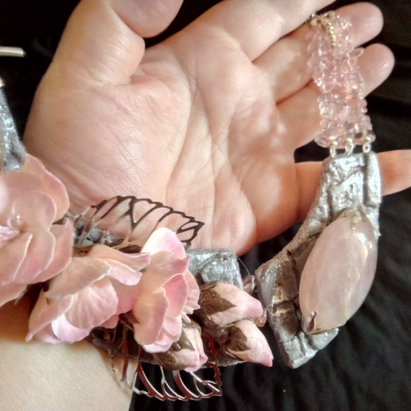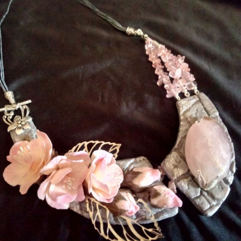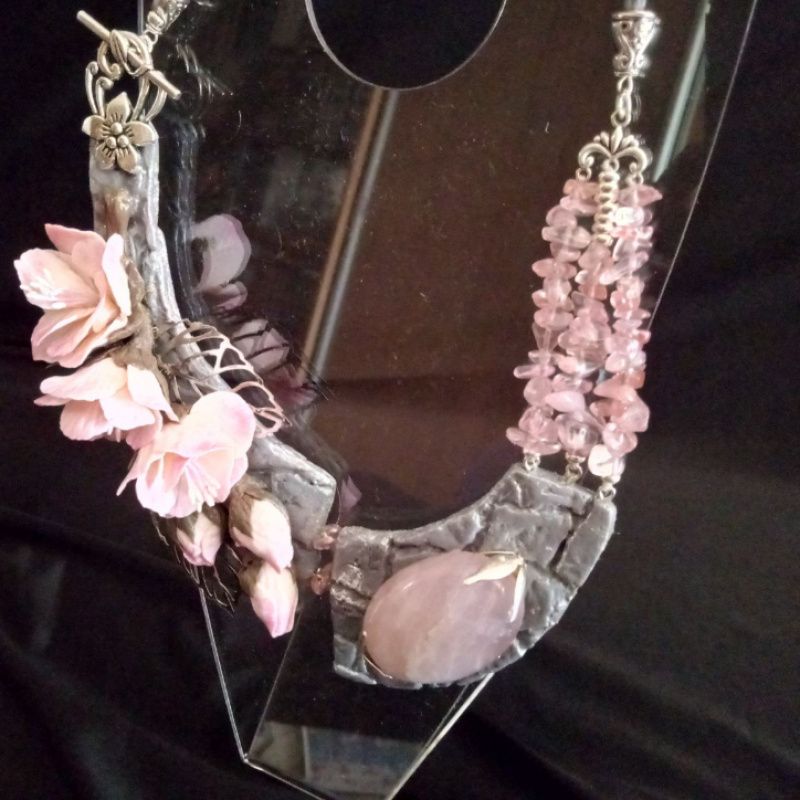 Колье выполнено в смешанной технике. Одна часть – площадка из полимерной глины со вставленным кабошоном розового кварца (4х3 см) соединённая со шнурами нитками бусин - сколов из розового кварца.