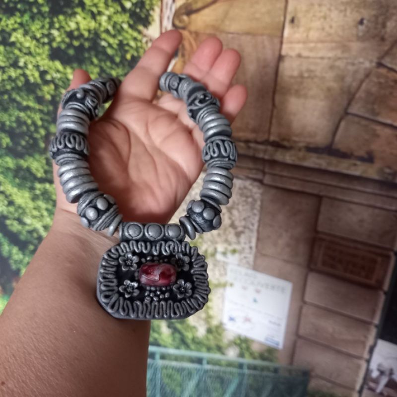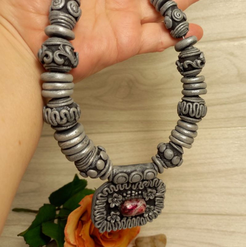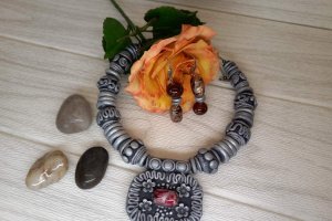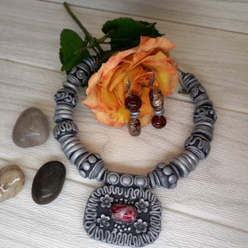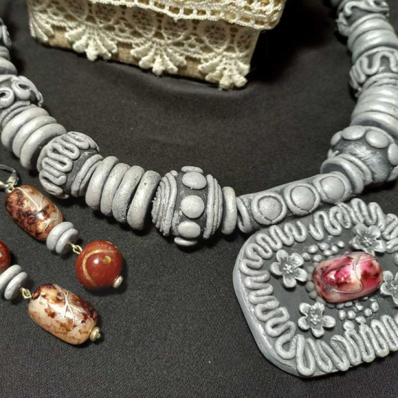 Комплект украшений, состоящий из колье и серёжек в этно-стиле. Выполнен из холодного фарфора. Основа – проволока. Застёжка тоггл из серебристого металла. Цвет серо-серебристый.