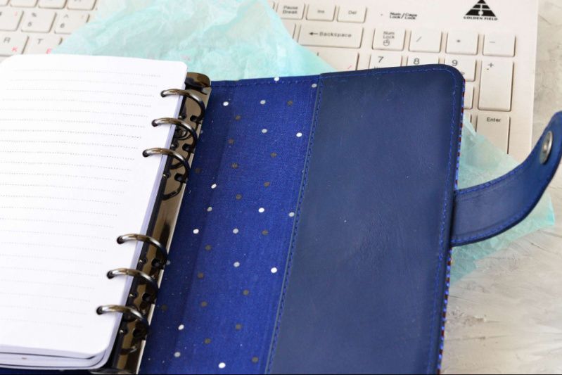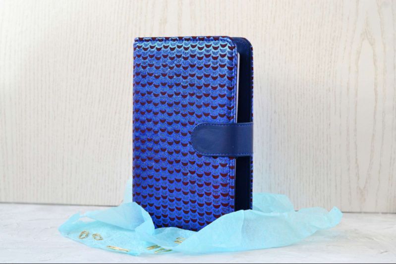 Обложка планера жесткая. Сверху - натуральная кожа яркого синего цвета, металлик, с небольшим эффектом кракле.