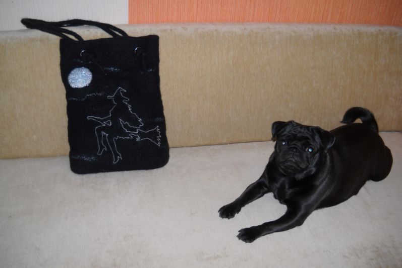 Размер сумки: 38x27x5 см. Длина ручки: 70 см. Внутри два цельновалянных кармашка.