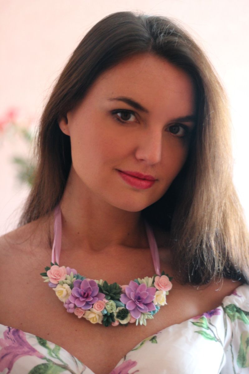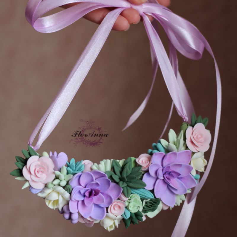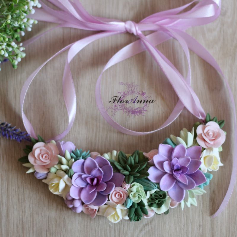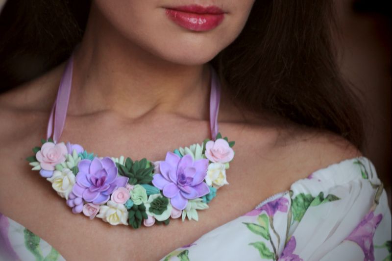 Если Вы любите оригинальные и стильные украшения, авторское колье с суккулентами, розами и фрезиями- это лучший вариант для проявления индивидуальности. Эти цветы очень необычные, максимально напоминают живые. Композиция состоит из разных цветочков зеленого цвета ,нежные сиреневые цветы, фрезии цвета айвои и персиковые розочки.