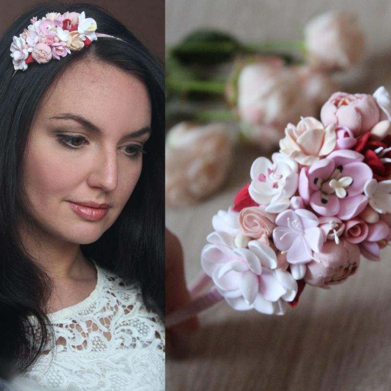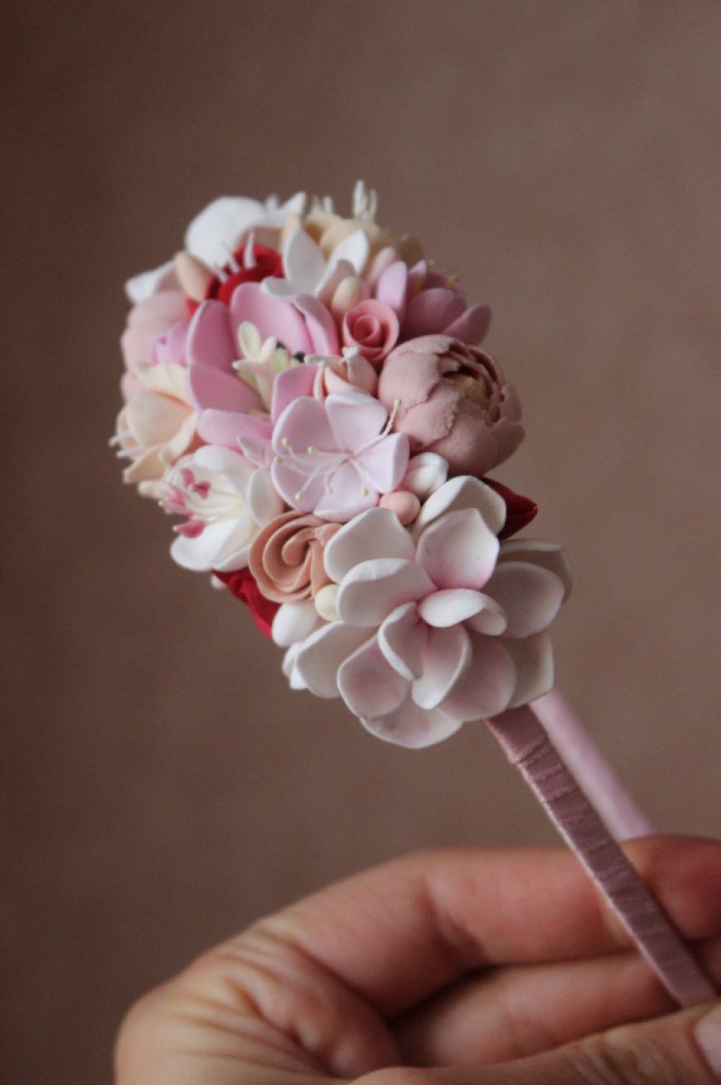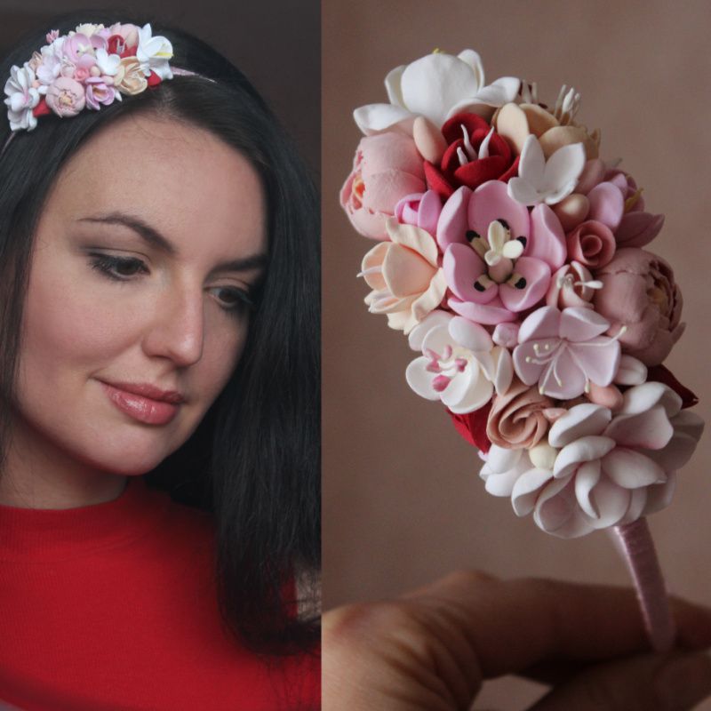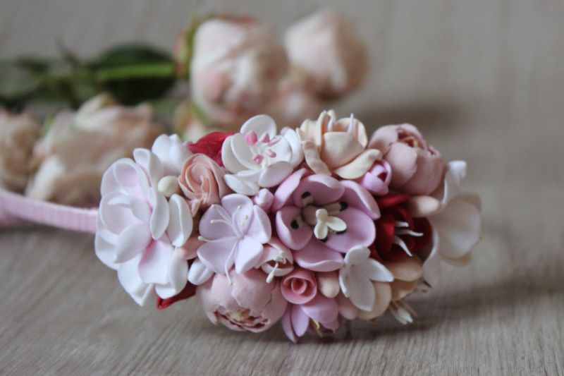 Каждый цветочек слеплен вручную из японской полимерной глины. Цветы очень легкие, практические невесомые. Основа ободка металлическая, обкручена ленточкой. Цветы надежно приклеены на металлическую основу ободка.