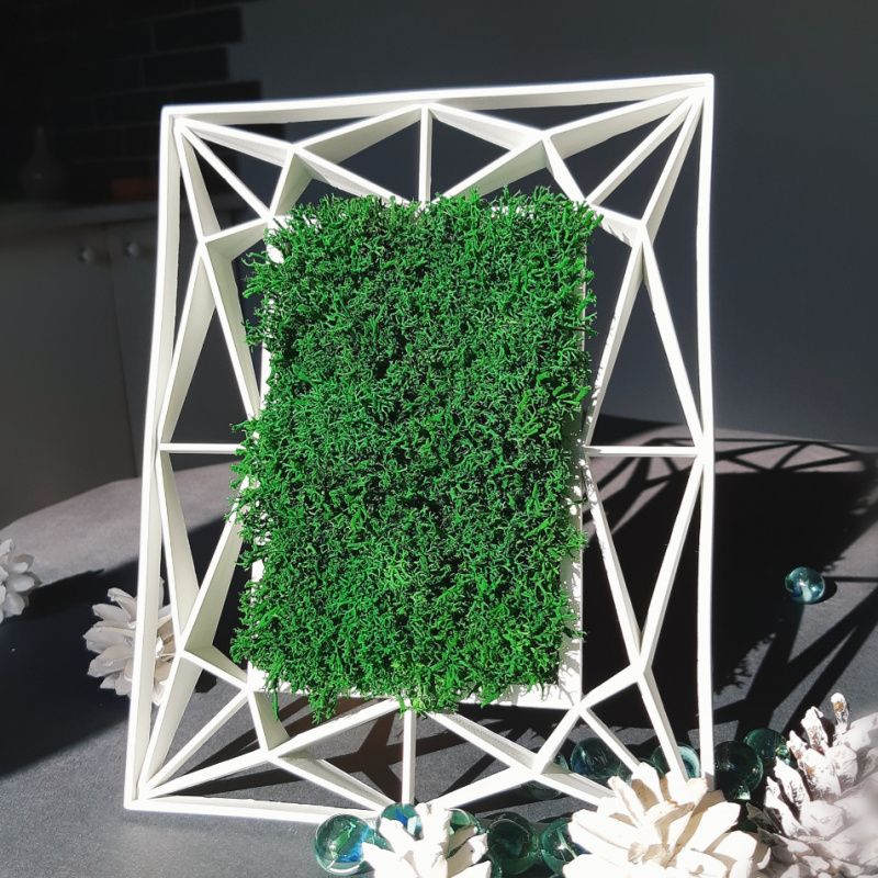Использование стабилизированного мха во флористике сегодня набирает обороты. И это не удивительно. Мох долговечен, не требует ухода, а выглядит очень необычно. Весь уход за ним заключается в том, чтобы примерно 1 раз в месяц сдуть с него пыль и, если он со временем подсохнет, слегка сбрызнуть водой из пульверизатора. Увидеть его можно в самых разных комбинациях. У меня он поселился в декоративной рамке