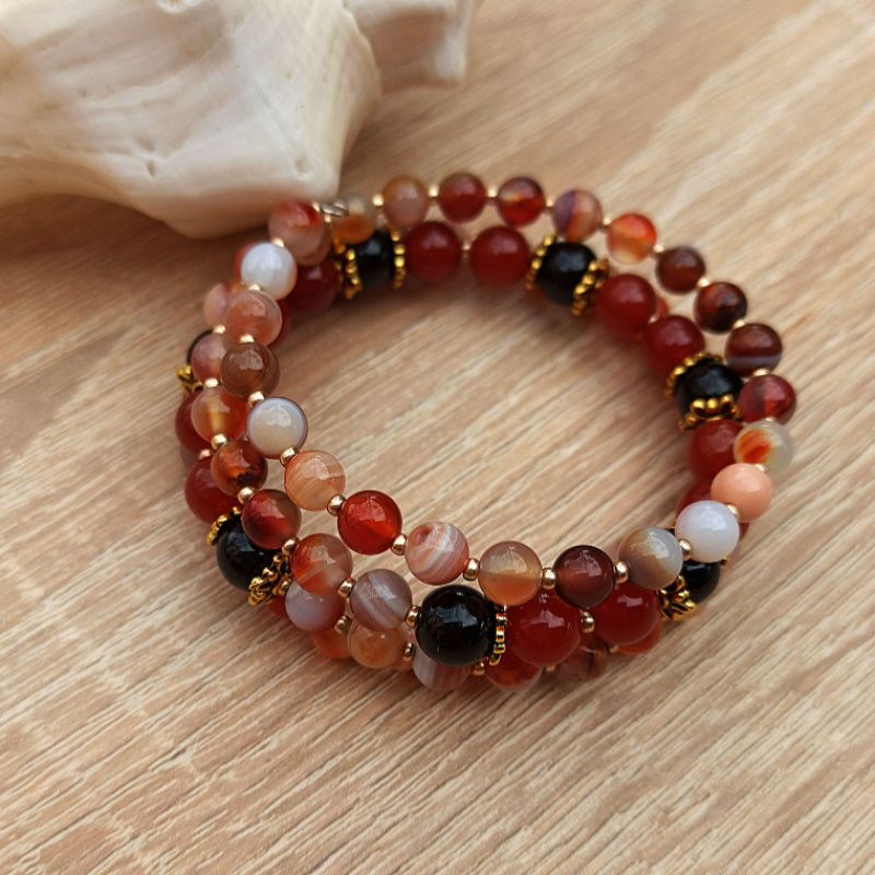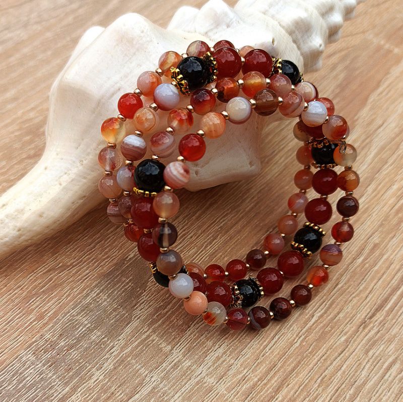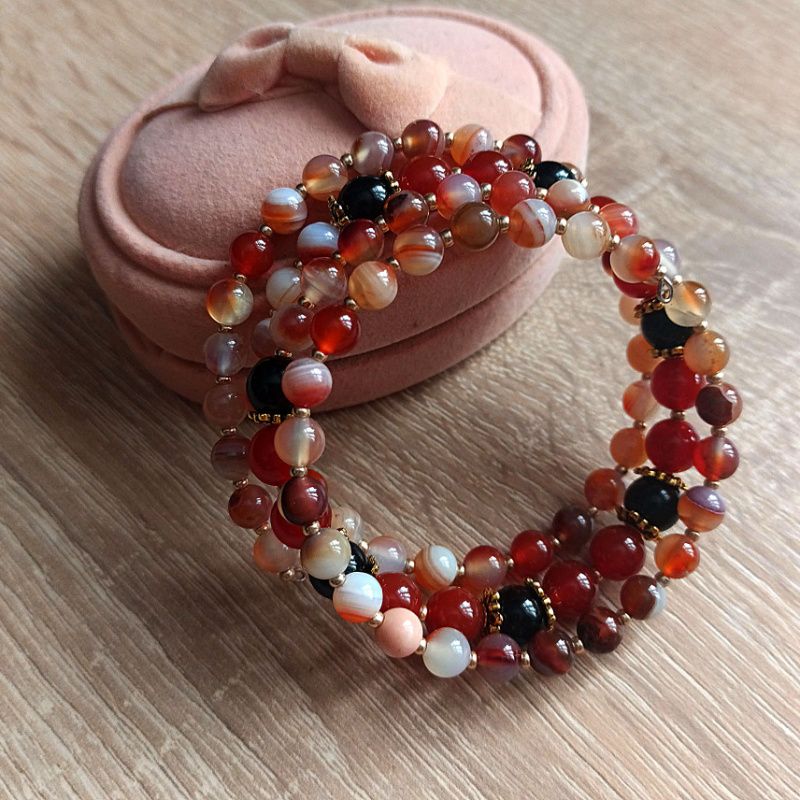 Браслет виготовлено з полосатого та червоного агату і чорного шунгіту, з використанням фурнітури срібного кольору, на дроті з пам′яттю (меморі-дріт) на три з половиною оберти навколо зап′ястя.