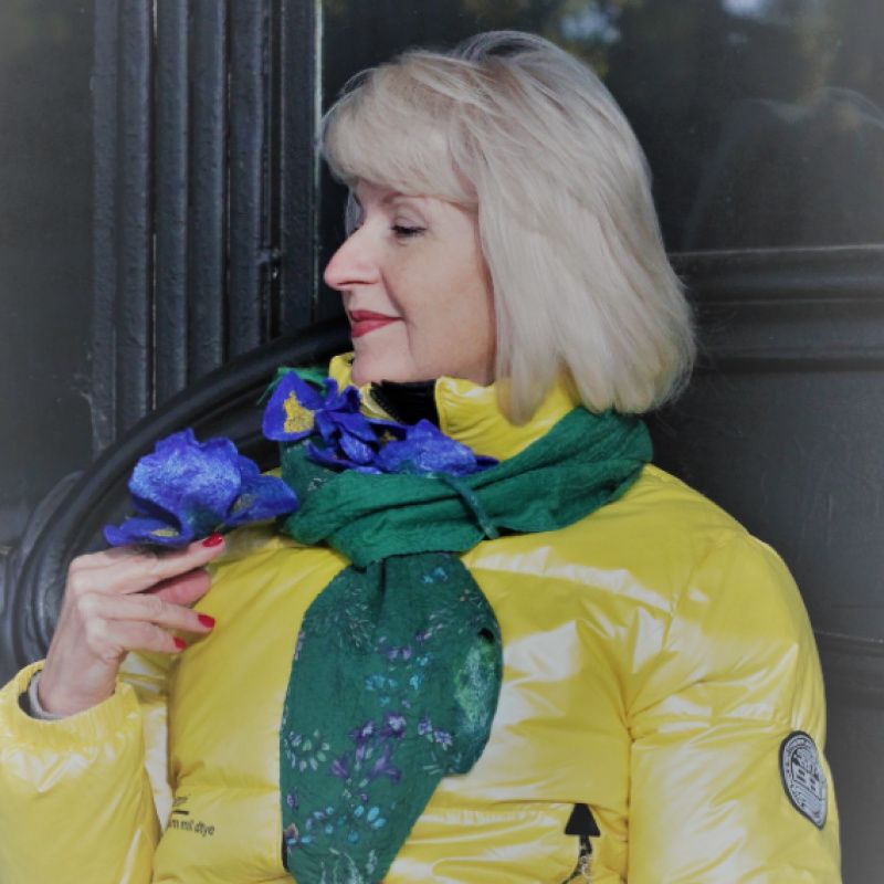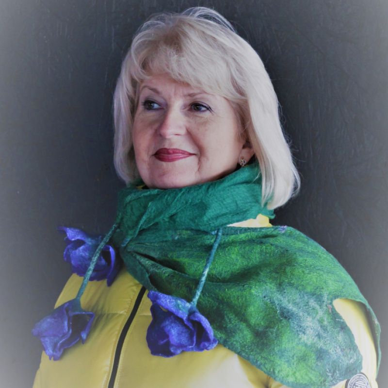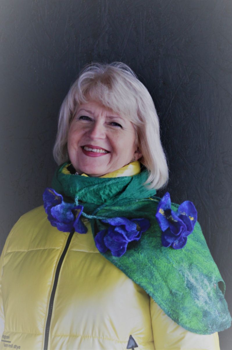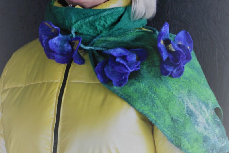 Шарф женский 'Ирисы' зеленого цвета выполнен в технике мокрого валяния, украшен объемными валяными цветками синего цвета с желтыми серединками. Рисунок из шерсти декорирован вискозой, шелком, бамбуком. Шарф очень стильный, хорошо драпируется в разных вариантах цветов и рисунков. Шарф выполнен в единственном экземпляре. По заказу такой шарф будет выполняться не копия, а новая версия) Точная копия невозможна.