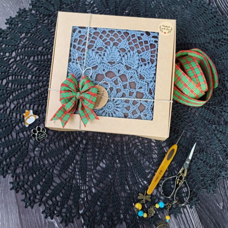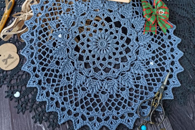 Элегантная салфетка украсит ваш интерьер. Идеально подходит к мебели из темного дерева. Если вам необходим реквизит для прекрасных фотосессий, не проблема. Эта салфетка отлично подойдет для использования в качестве второго плана. Диаметр 33см, цвет серый, с едва заметным голубым оттенком (фото делает его очень броским). Блокирована жидким крахмалом*, поэтому при необходимости смело можно постирать и снова растянуть на ровной поверхности. *Можно приобрести подкрахмалитель для белья. Отлично себя зарекомендовал.