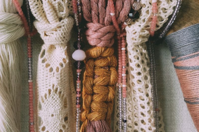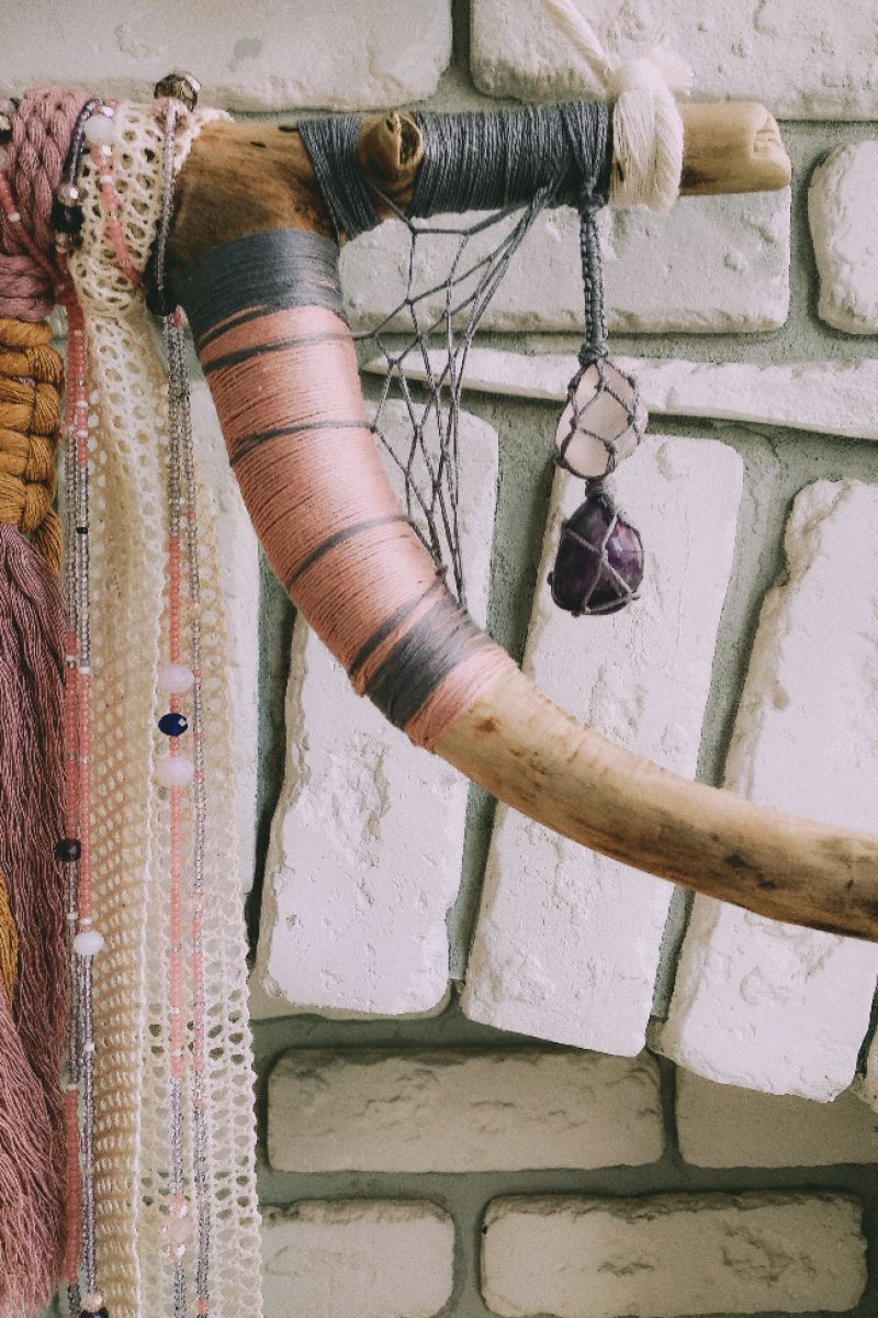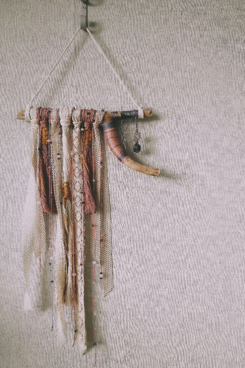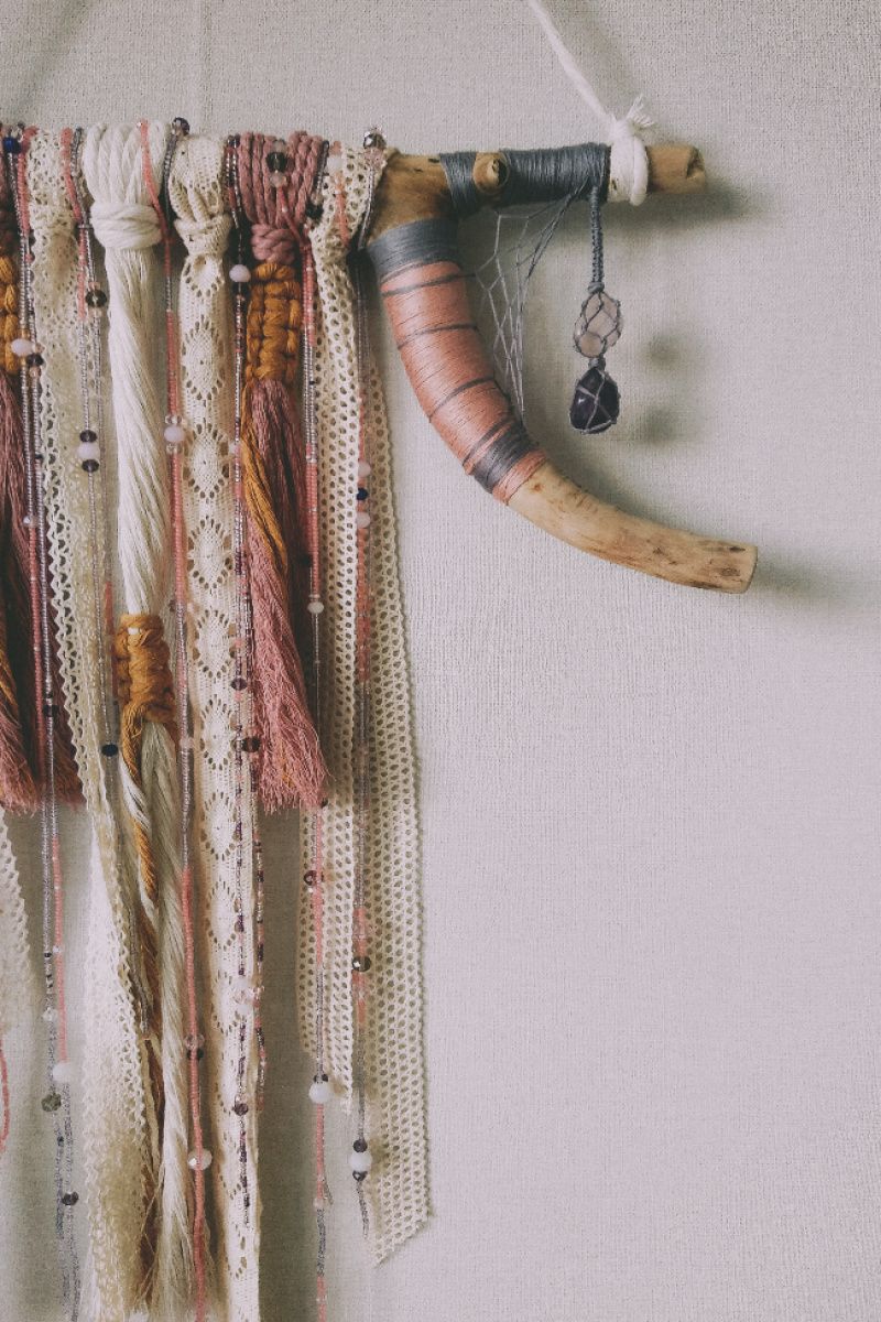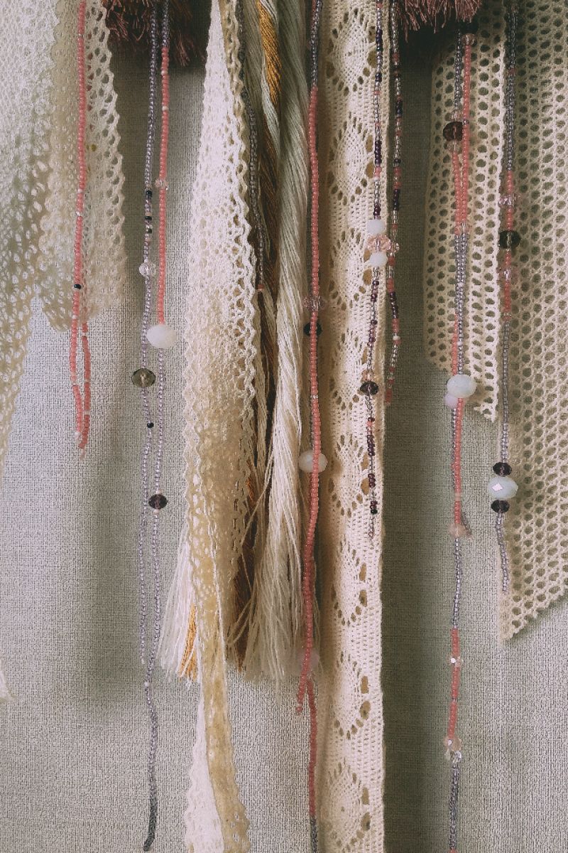 Оригинальное панно в стиле бохо из натурального кружева, с вплетением рядов чешского бисера, стеклянных бусин, кристаллов розового кварца и аметиста. Имеет элемент ловца снов.