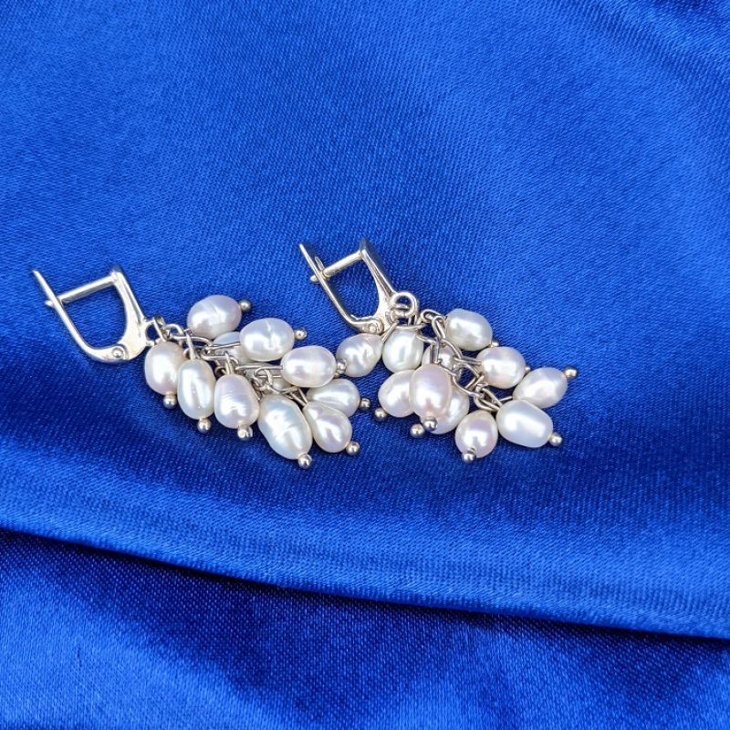 В наличии красивые серебряные серьги с белым жемчугом. Сделаны из натуральных материалов в одном экземпляре. Такие украшения хорошо подойдут для неповторимых женщин в качестве подарка к праздникам. Общая длина 4см.