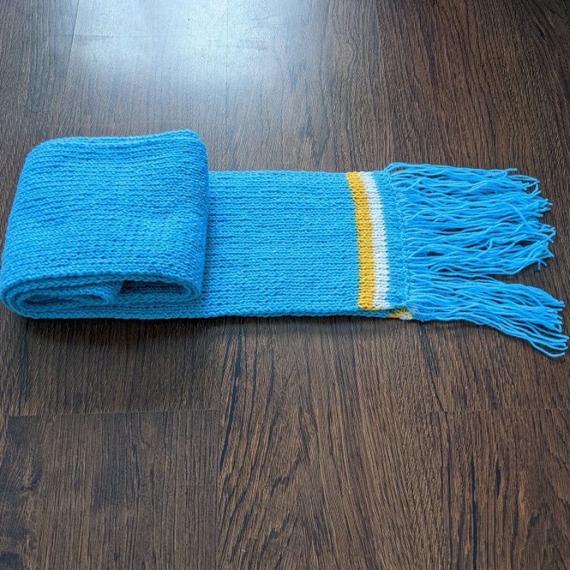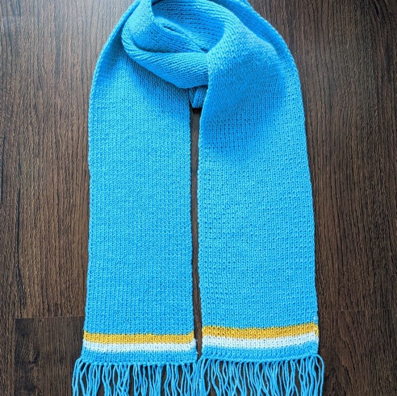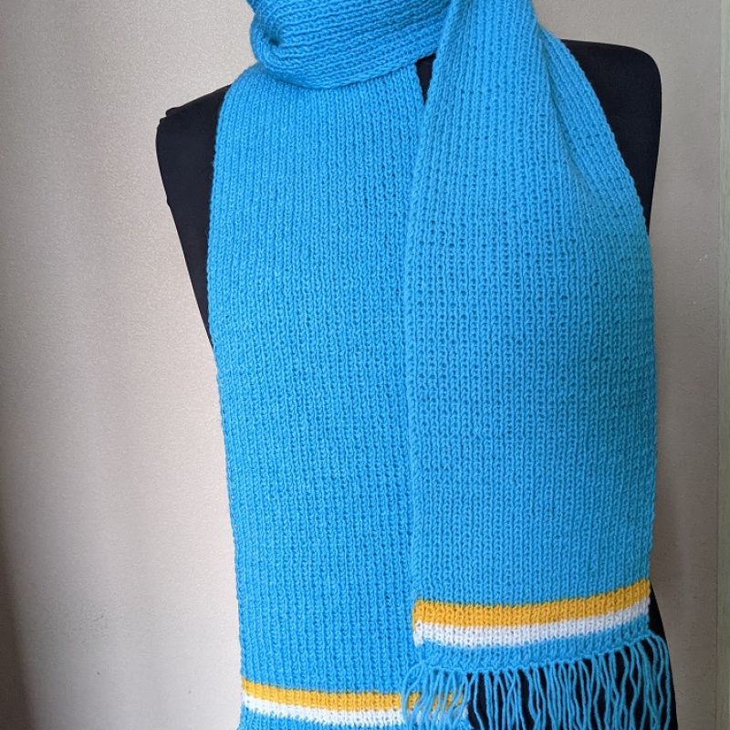 В наличии красивый шарф ручной работы в патриотическом стиле (вязание спицами). Прекрасно подойдет как для мужчин, так и для женщин. Сделан в одном экземпляре, материал: полушерсть.