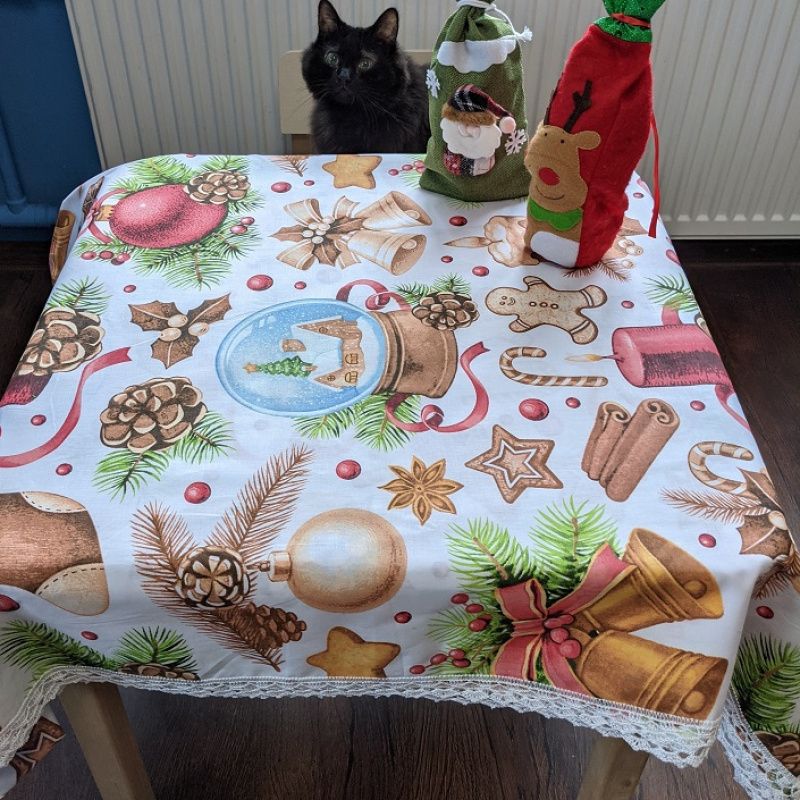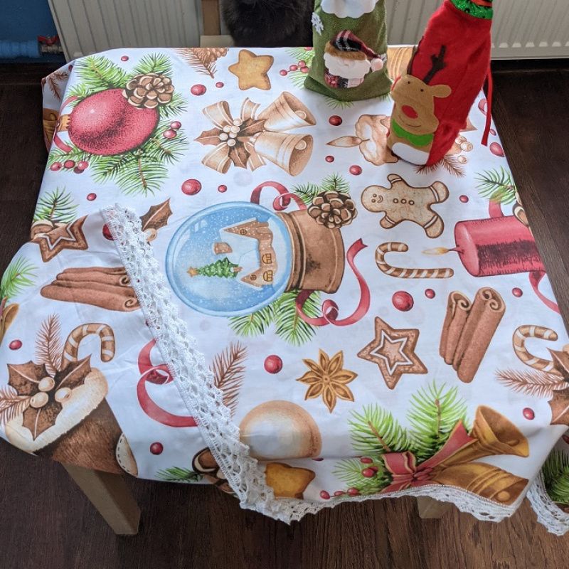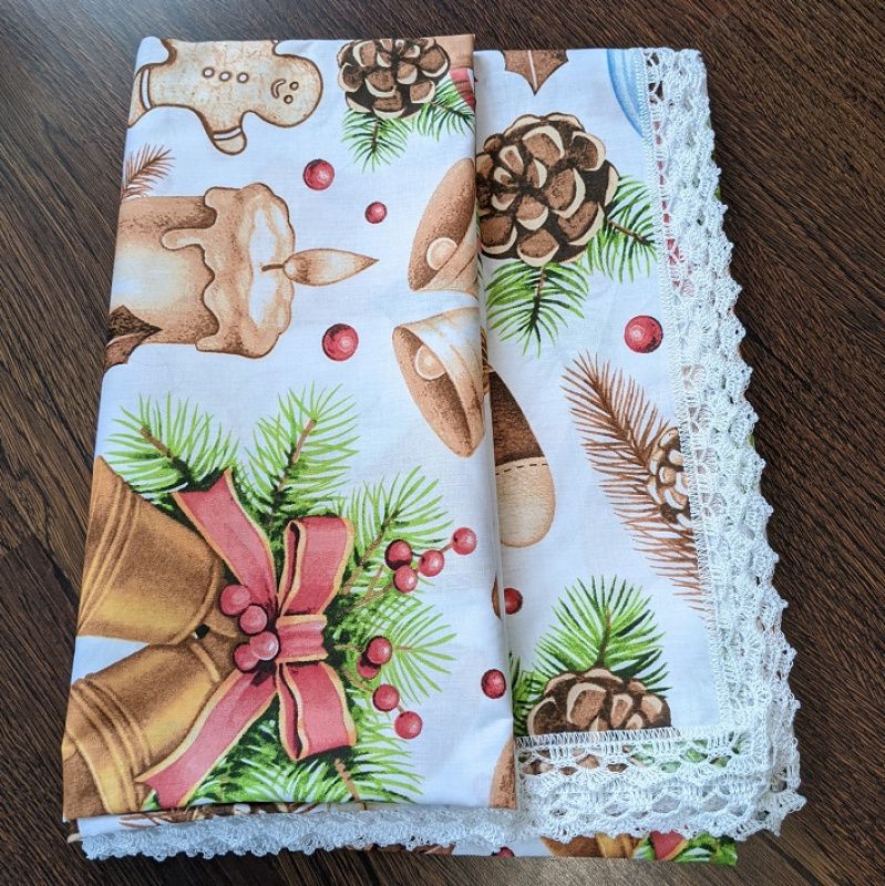 В наличии новогодняя скатерть украшена кружевом ручной работы (ручная вязка крючком). Сделана в одном экземпляре. Материал 100% хлопок, размер 205X165 см. Такая скатерть прекрасно дополнит интерьер вашего дома или станет неповторимым подарком к праздникам.