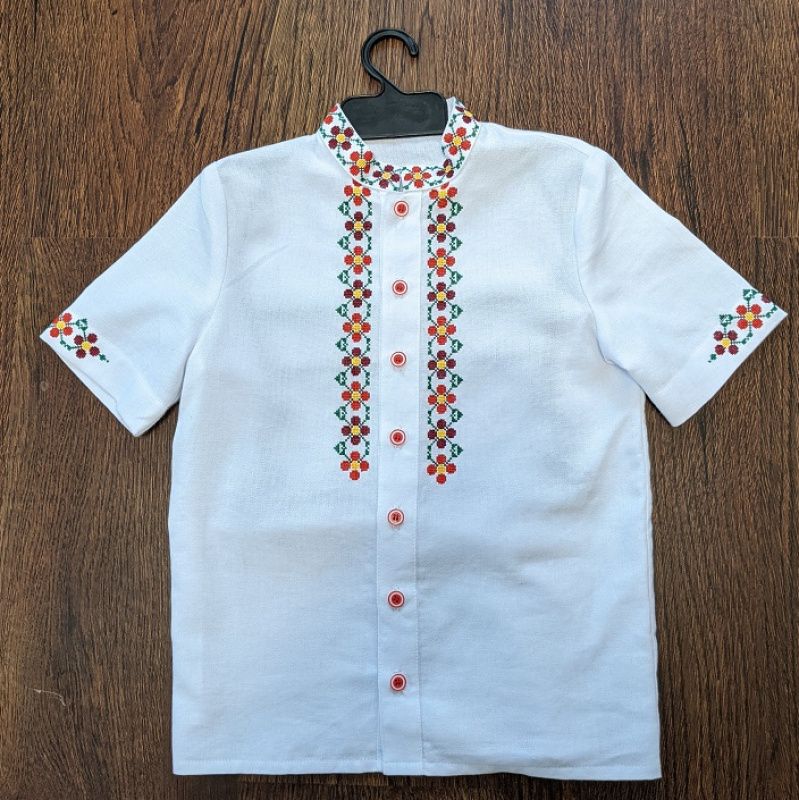 В наличии стилизованная красивая вышитая рубашка для мальчика ручной работы. Сделана в одном экземпляре из натуральных материалов: домотканое полотно и 100% хлопок. Подойдет на рост 122-128 см, но ориинтуйтесь на замеры: ширина по груди 37-38 см, дожина 49 см, рукав 20 см.