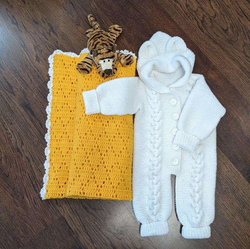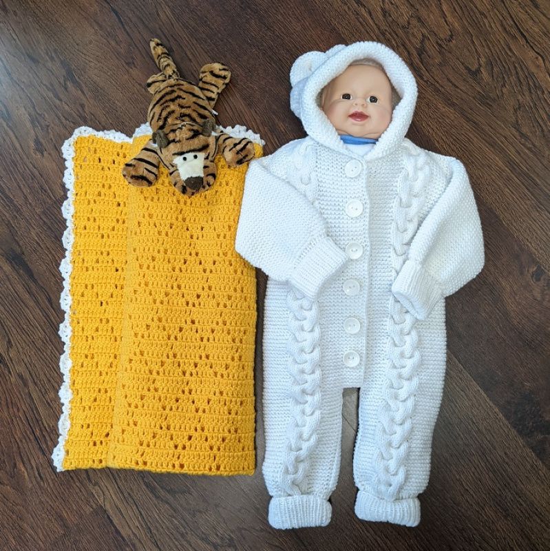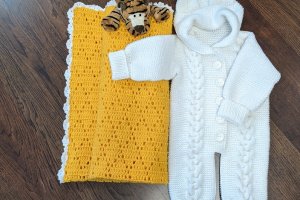 В наличии детский комплект ручной работы: детский комбинезон и одеяло. Изделие сделано из натуральных материалов: полушерсть. Комбинезон подойдет для детей от 6 месяцев до 1,5 года. Размер одеяла 110-115 см. Такой комплект станет хорошим подарком на именины, крестины или другие праздники для ребенка. Желтый цвет прекрасно подходит как мальчику так и девочке.