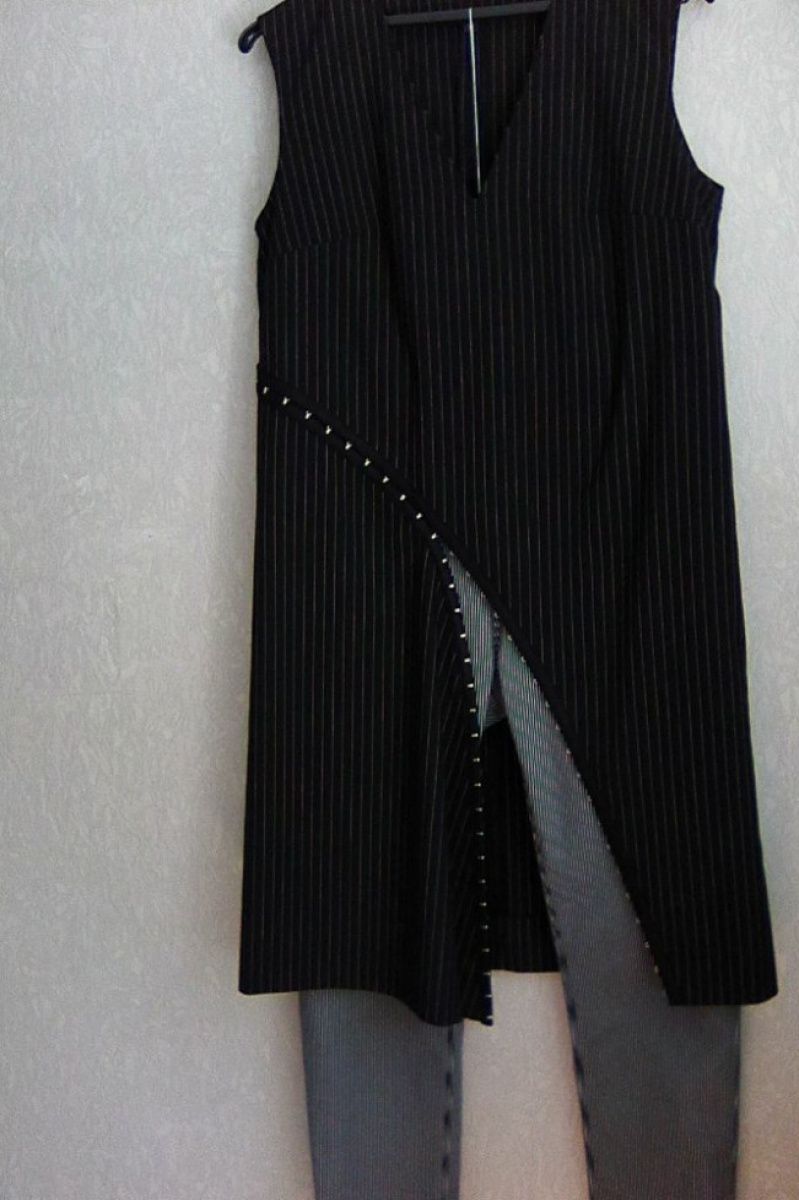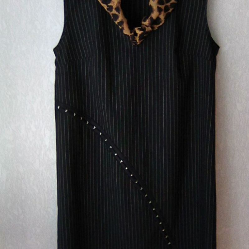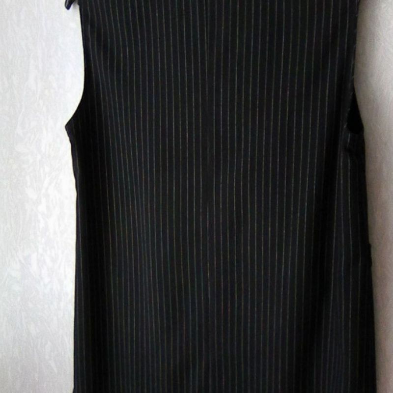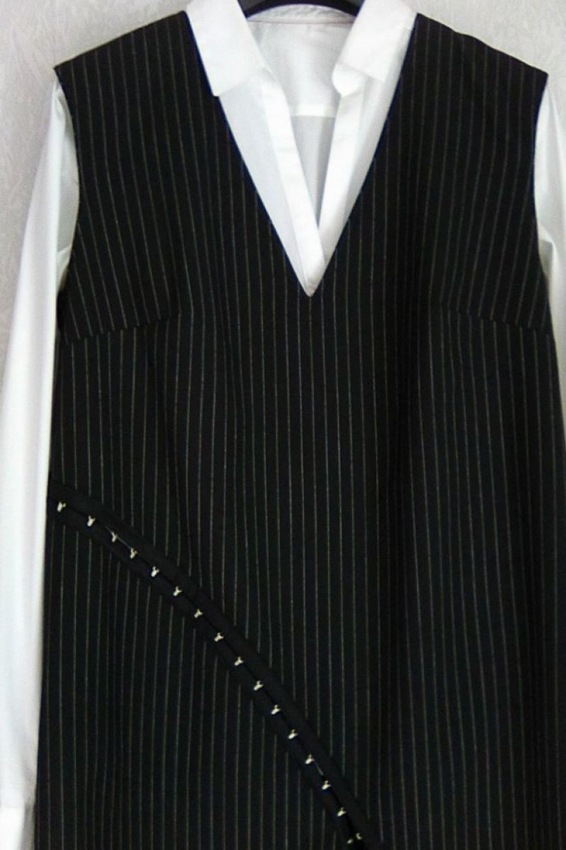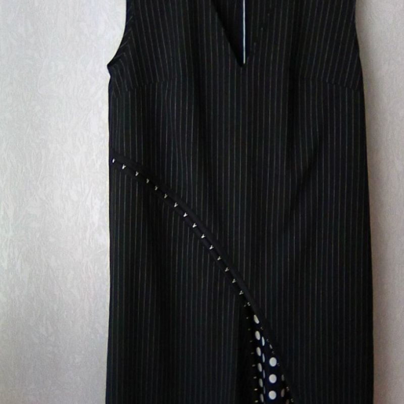 Дизайнерское платье, сделанное под заказ из костюмной вискозы черного цвета в тонкую белую полоску. Для офиса, для работы, для учебы, для повседневного использования. Крой трапеция, треугольный вырез, без рукавов. Оригинальная деталь переда – застежка на крючки от края к низу позволяет регулировать высоту разреза платья. Платье хорошо комплектовать с блузой, футболкой, рубашкой, гольфом, брюками, юбкой, пальто, курткой и другой одеждой в зависимости от сезона. Содержимое ткани: вискоза 80%, полиэстер-полиамид 20%, эластан 5%. Ткань средней плотности, не мнется, сохраняет форму. Размер 40 EU (46 укр). Длина спинки – 100 см, ширина по груди – 53 см, ширина по бедрам – 55 см.