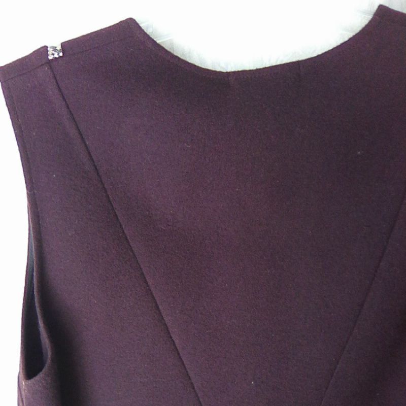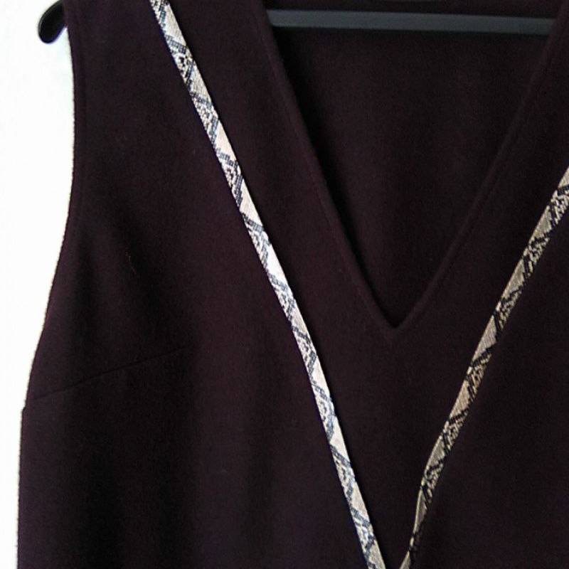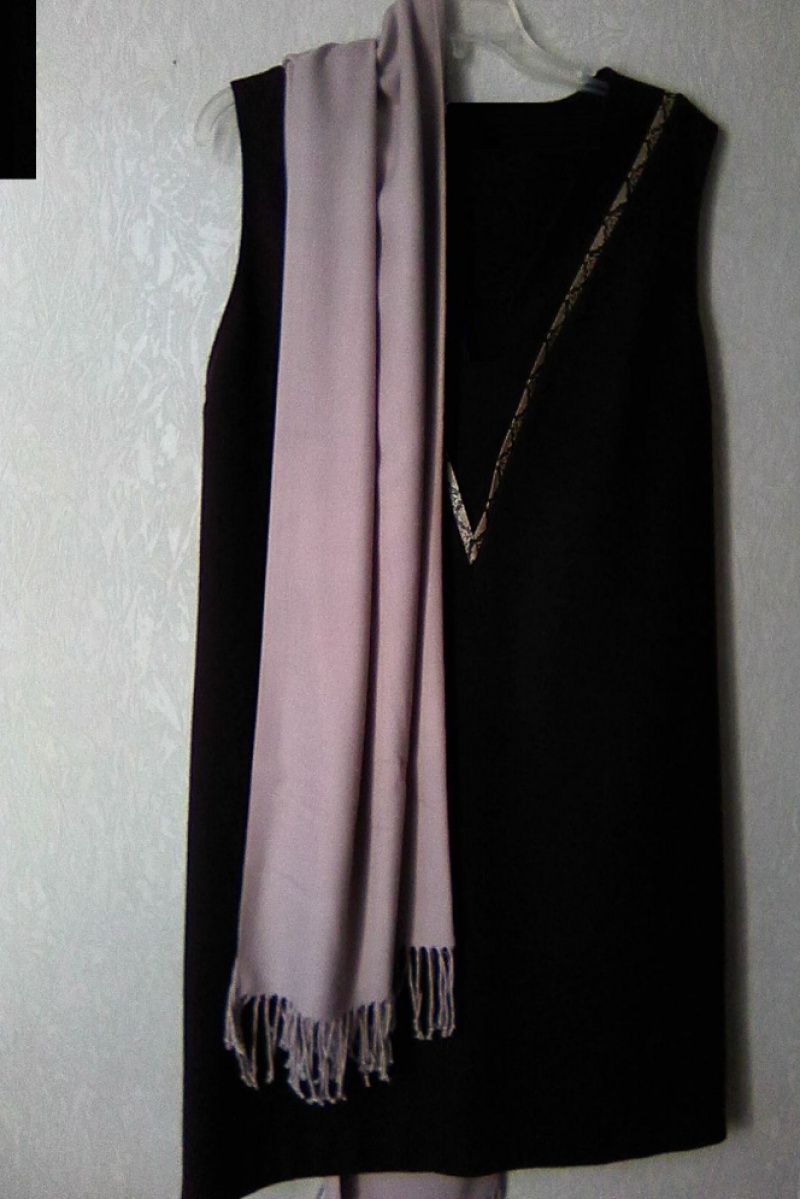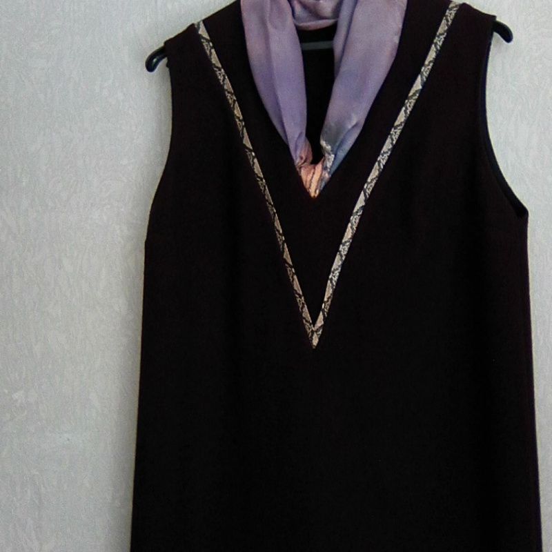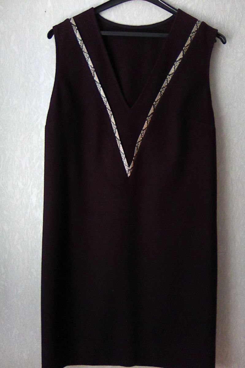 Дизайнерское платье, сделанное под заказ шерстяное, цвета баклажан. Для офиса, для работы, для обучения, повседневного использования. Крой трапеция, треугольный вырез, украшенный контрастной тесьмой, без рукавов. Платье хорошо комплектовать с блузой, футболкой, рубашкой, гольфом, брюками, юбкой, пальто, курткой и другой одеждой в зависимости от сезона. Содержимое ткани: шерсть 80%, полиэстер 20%, Тонкое сукно не мнется, сохраняет форму. Размер 42 EU (48 укр) . Длина спинки – 100 см, ширина по груди – 53 см, ширина по бедрам – 56 см.