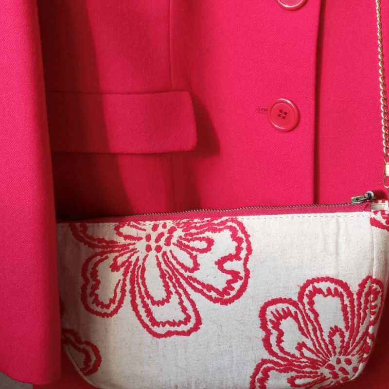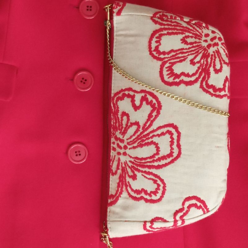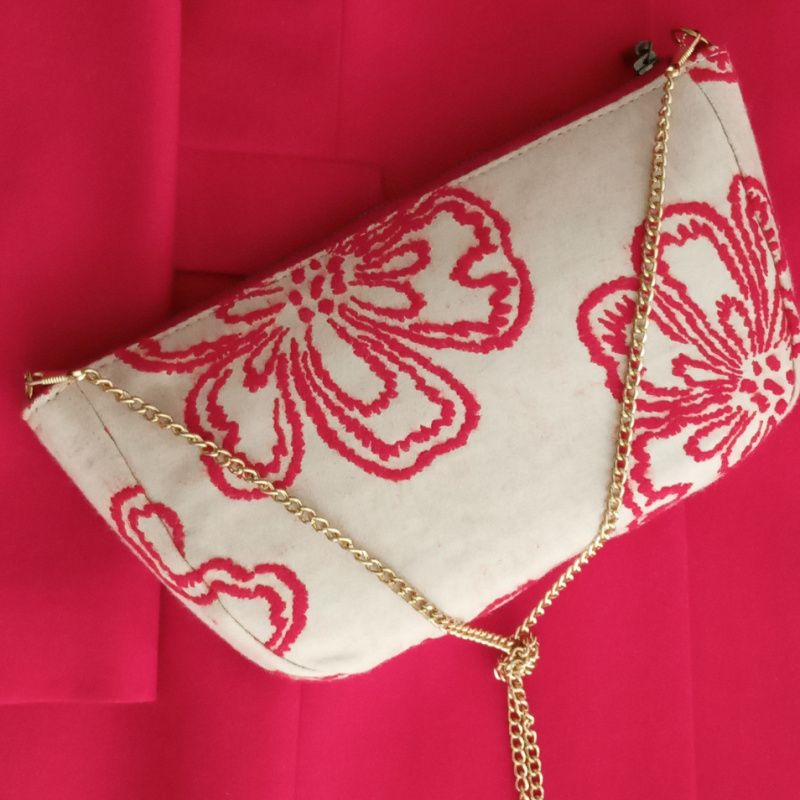 Новая искусственная эксклюзивная работа – маленькая бежево-красная сумочка-клатч с золотистой цепью. Шикарная шерстяная ткань с вышитыми цветами. Внутри подклад с карманом. Металлическая молния. Размеры: 28х16х4см, длина цепи 100см.