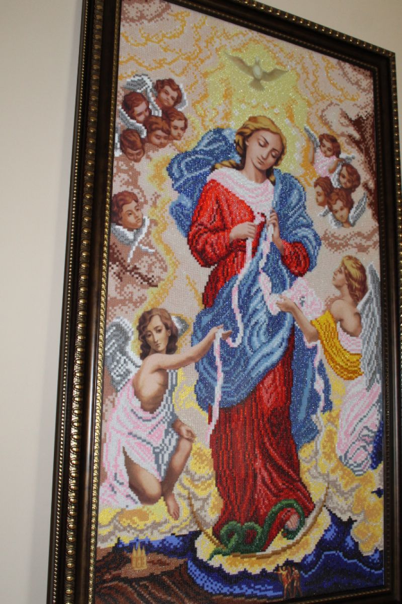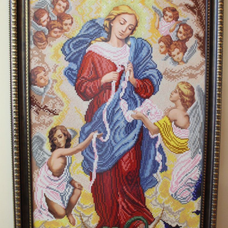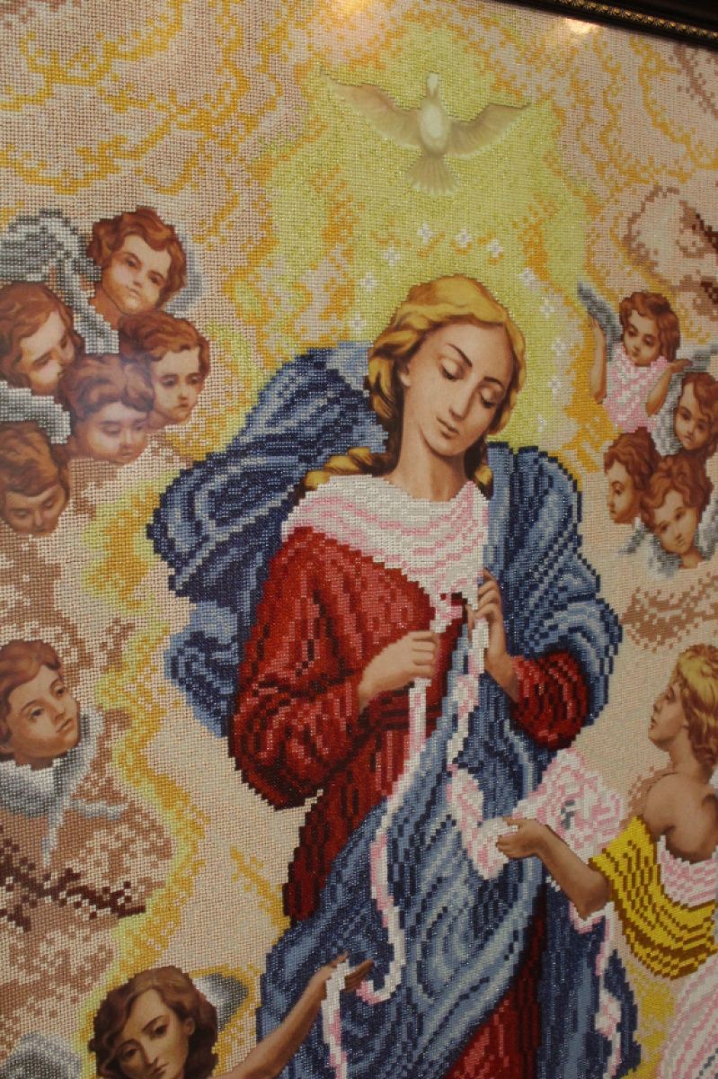 Вышитый образ Богородица, решает узлы ручной работы чешским бисером. Полная Зашивка. Размер 62,23см. × 111,76см. Более 155 500 тыс. Бисеринок. Антибликовое стекло, багет пластик. Образ очень красивый, большой. Вышитый с искренней молитвой и любовью.