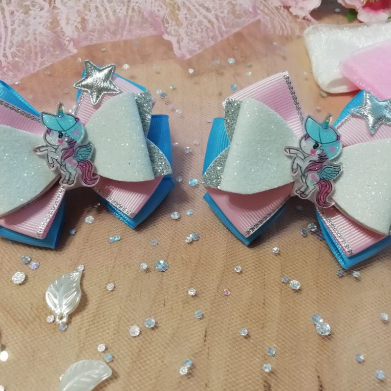 Многие девочки любят бантики с единорижкамы. Выполнены из репсового ленты и глитерного фоамирану (блестки НЕ осыпаются), украшенные ярким кабошоном. Размер 8 * 6 см, основа - резиночка 3,5 см. 90 грн-пара