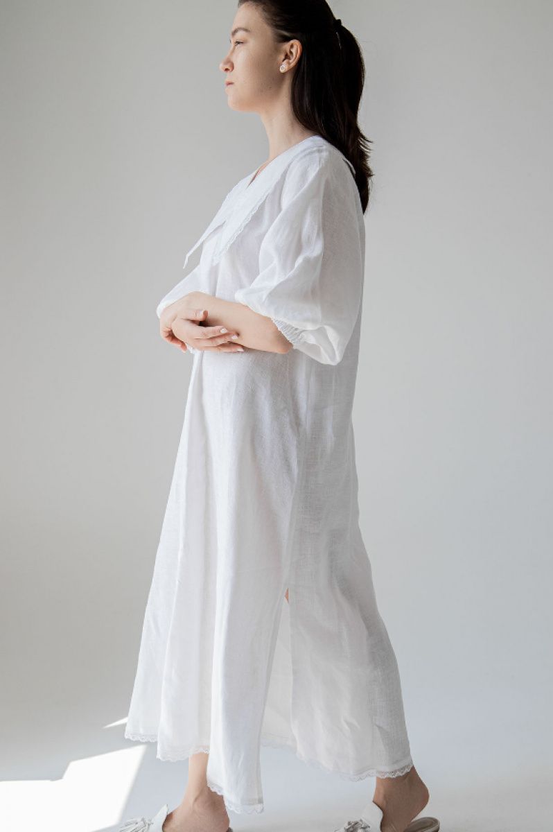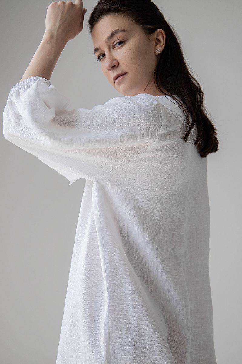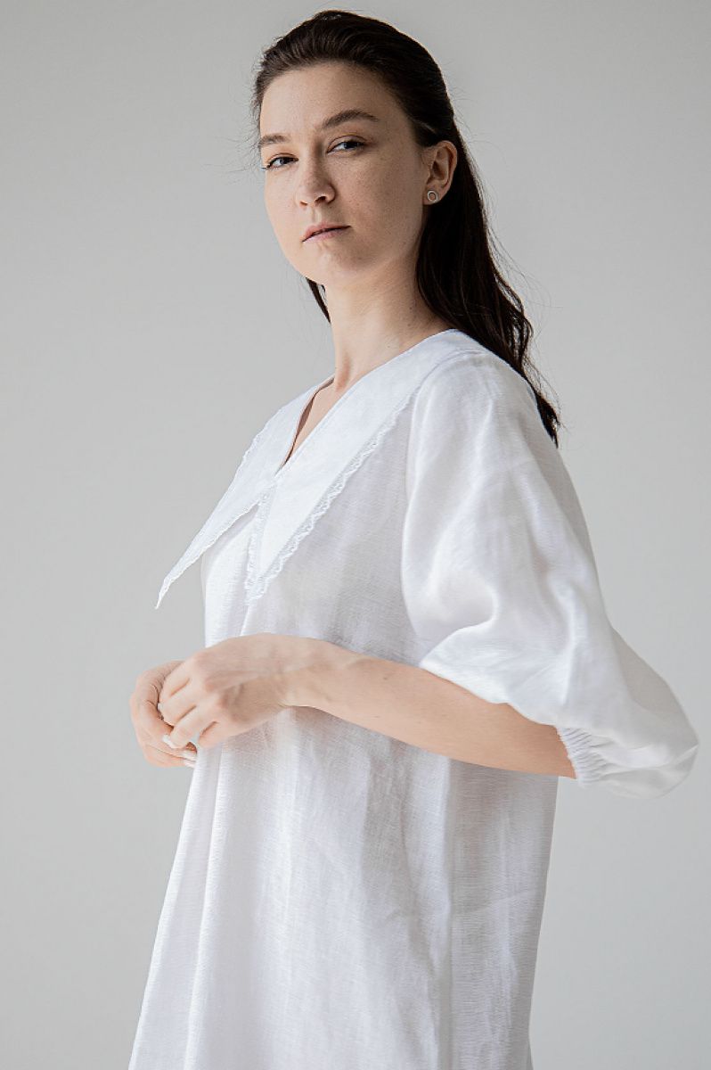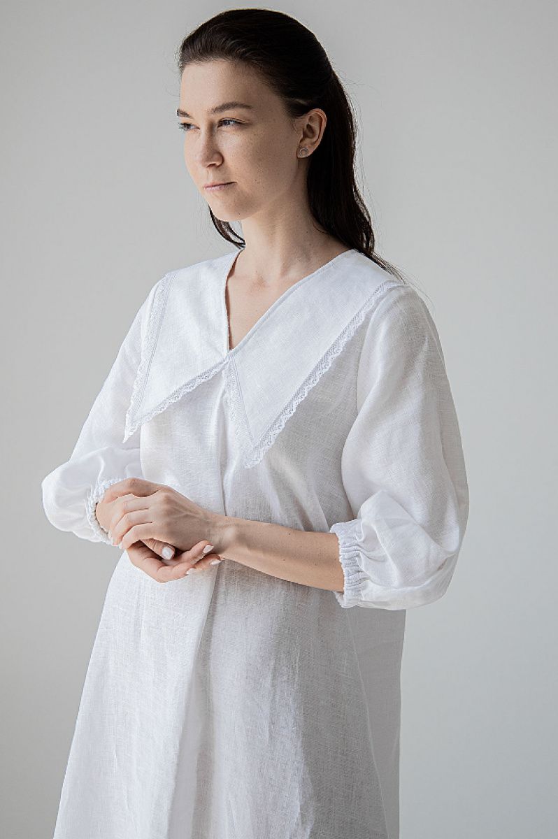 Платье свободного фасона с декоративным воротничком Рукава-фонарики на резинке Разрезы по бокам 30 см высотой Цвет: белый Материал: 100% хлопок отделка хлопковым кружевом на рукавах, внизу юбки и на ячейке Длина: 120 см Срок пошива 3-7 дней. Если Ваш заказ срочный, пожалуйста, укажите дату, до которой надо получить заказ в комментарии. Бренд: GNIZDO
