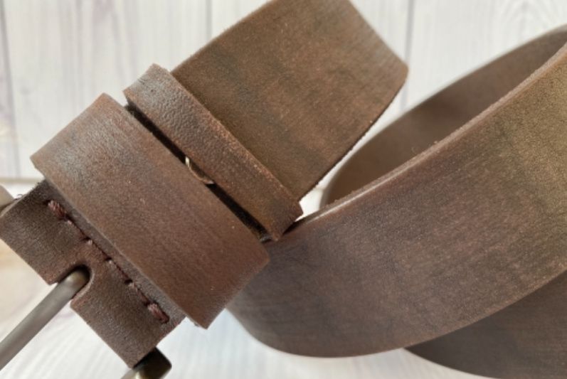 Стильный мужской ремень с потёртостью сделан из цельного куска телячьей кожи.