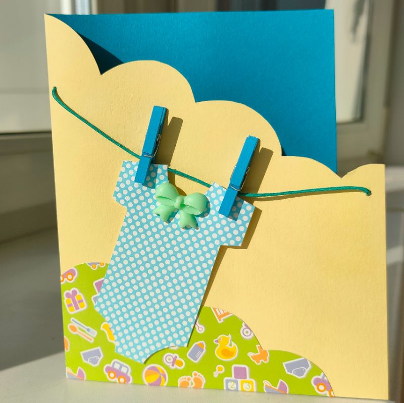 Открытка ручной работы, украшена декоративными прищепочками и бантиком