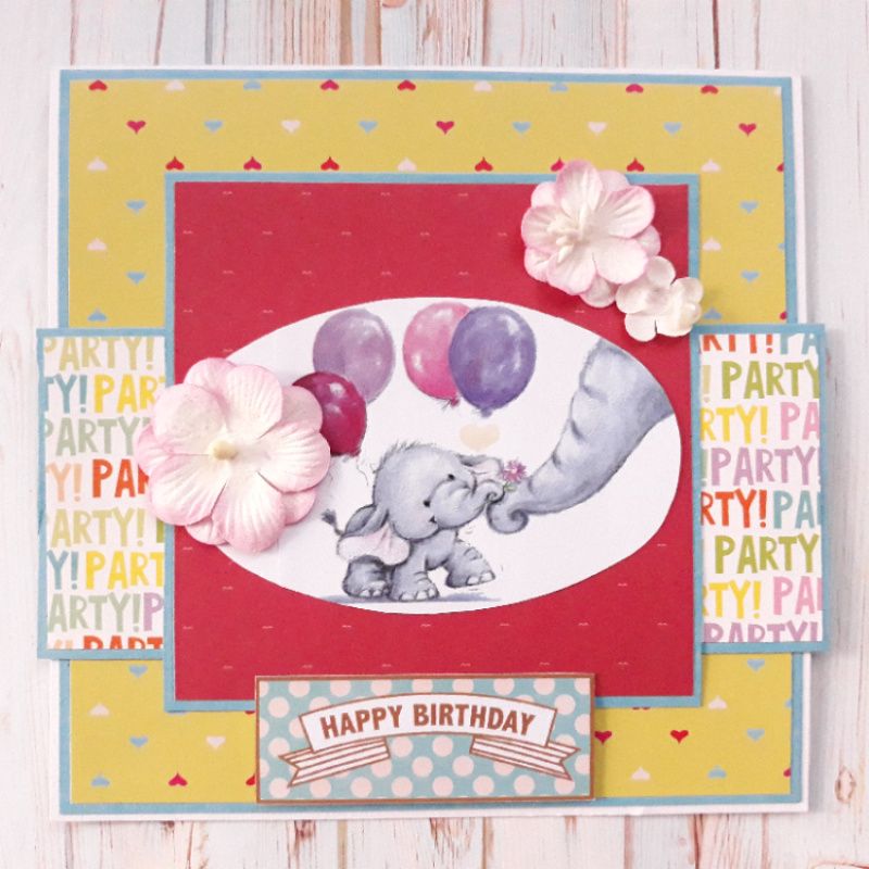 Яркая открытка именинника, изготовлена из дизайнерского картона и дизайнерской бумаги
