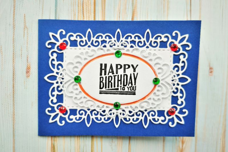 Открытка ручной работы, украшена ажурными рамочками и стразиками