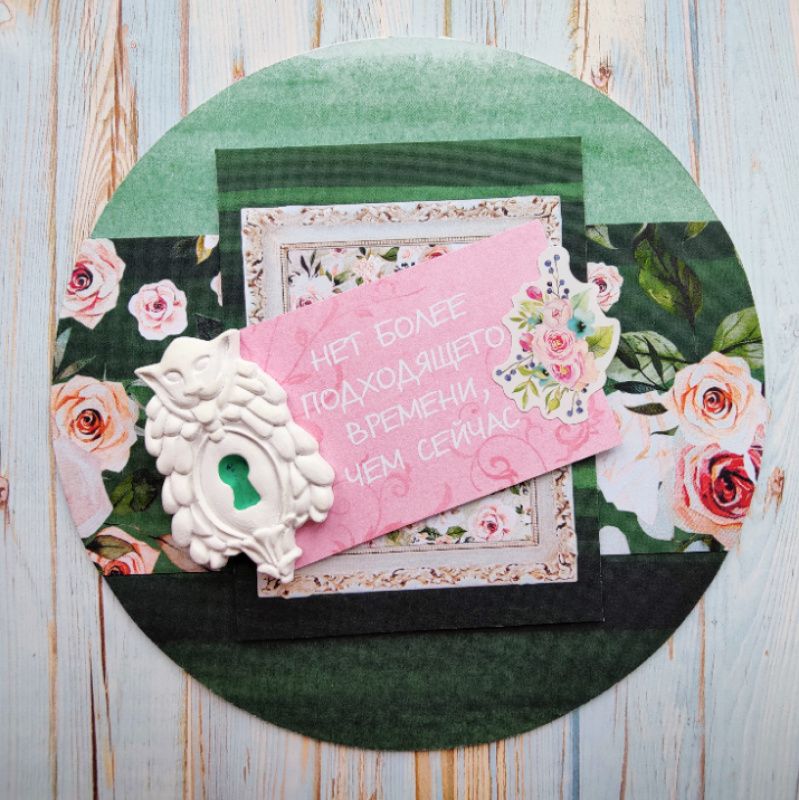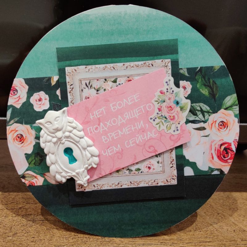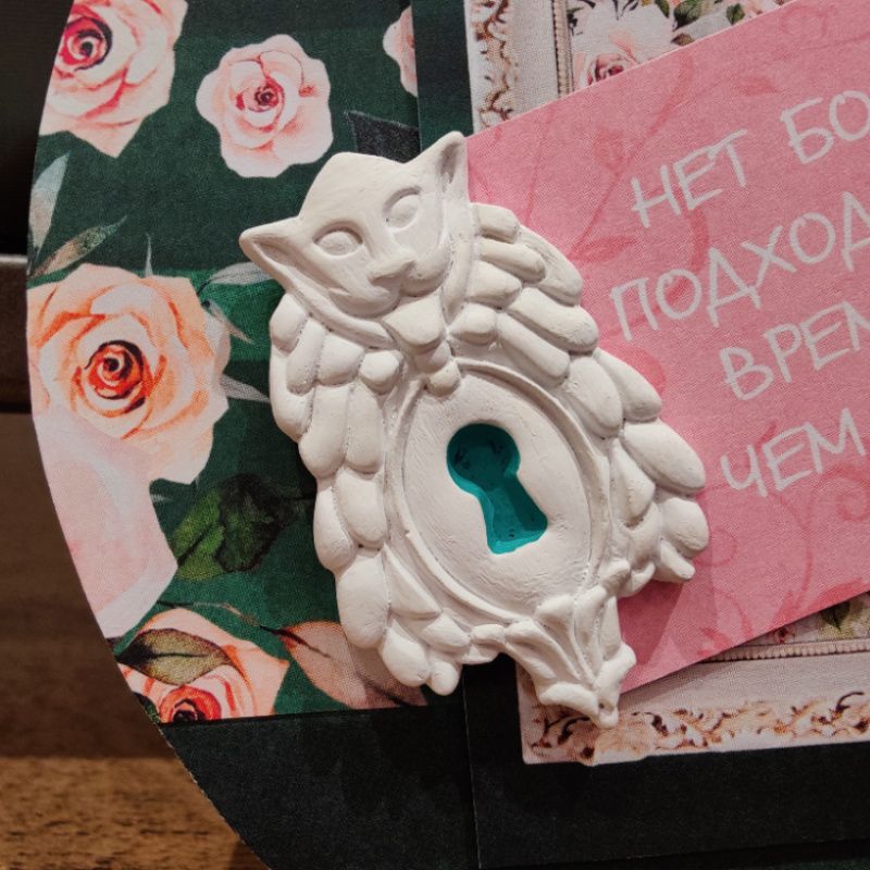 Круглая открытка, которая открывается ( для написания пожеланий ), для того чтобы она стояла ее нужно опирать на что-то. Украшена гипсовым львом