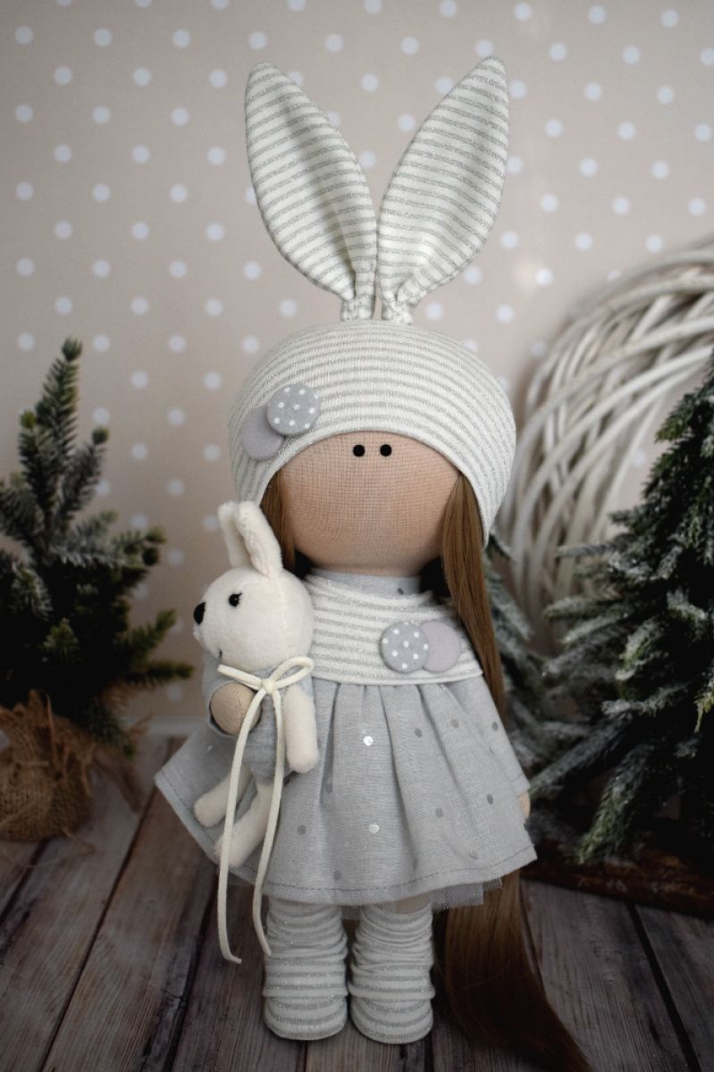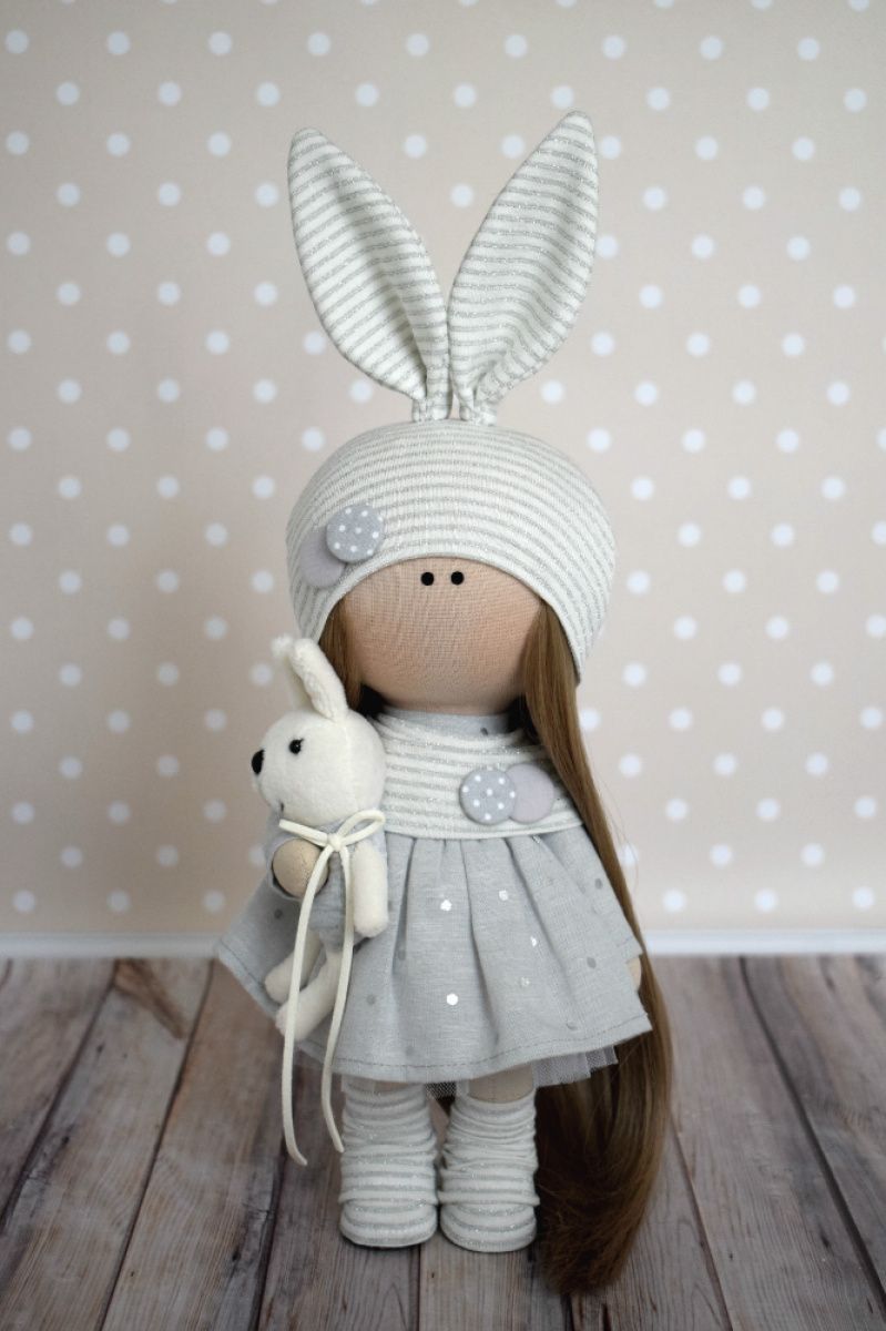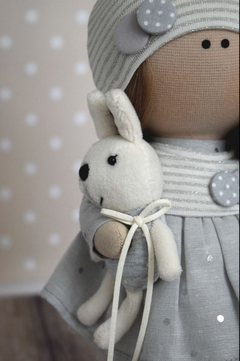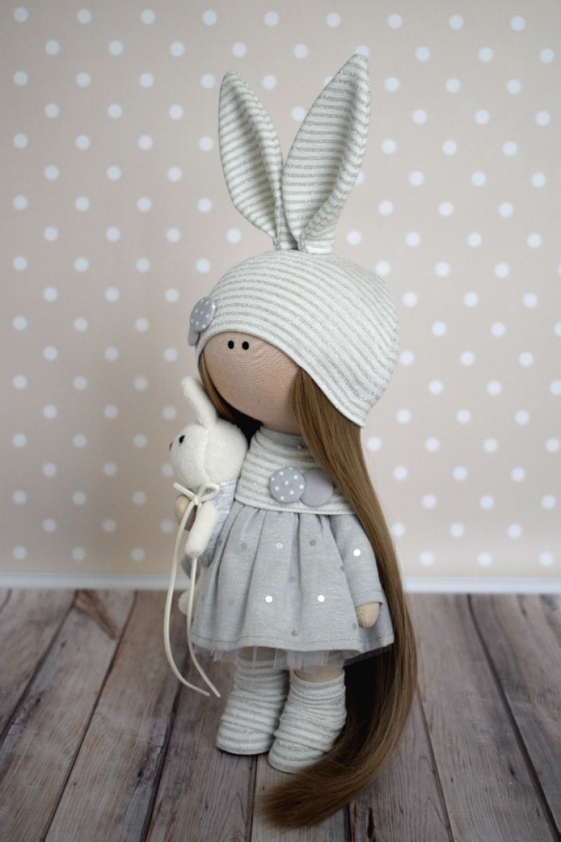 Девочка-малышка высотой 34см(с ушками).Кукла изготовлена из хлопка и трикотажа,для одежды использован лен,трикотаж,фатин.Волосы из кукольных трессов.Одежда не снимается.