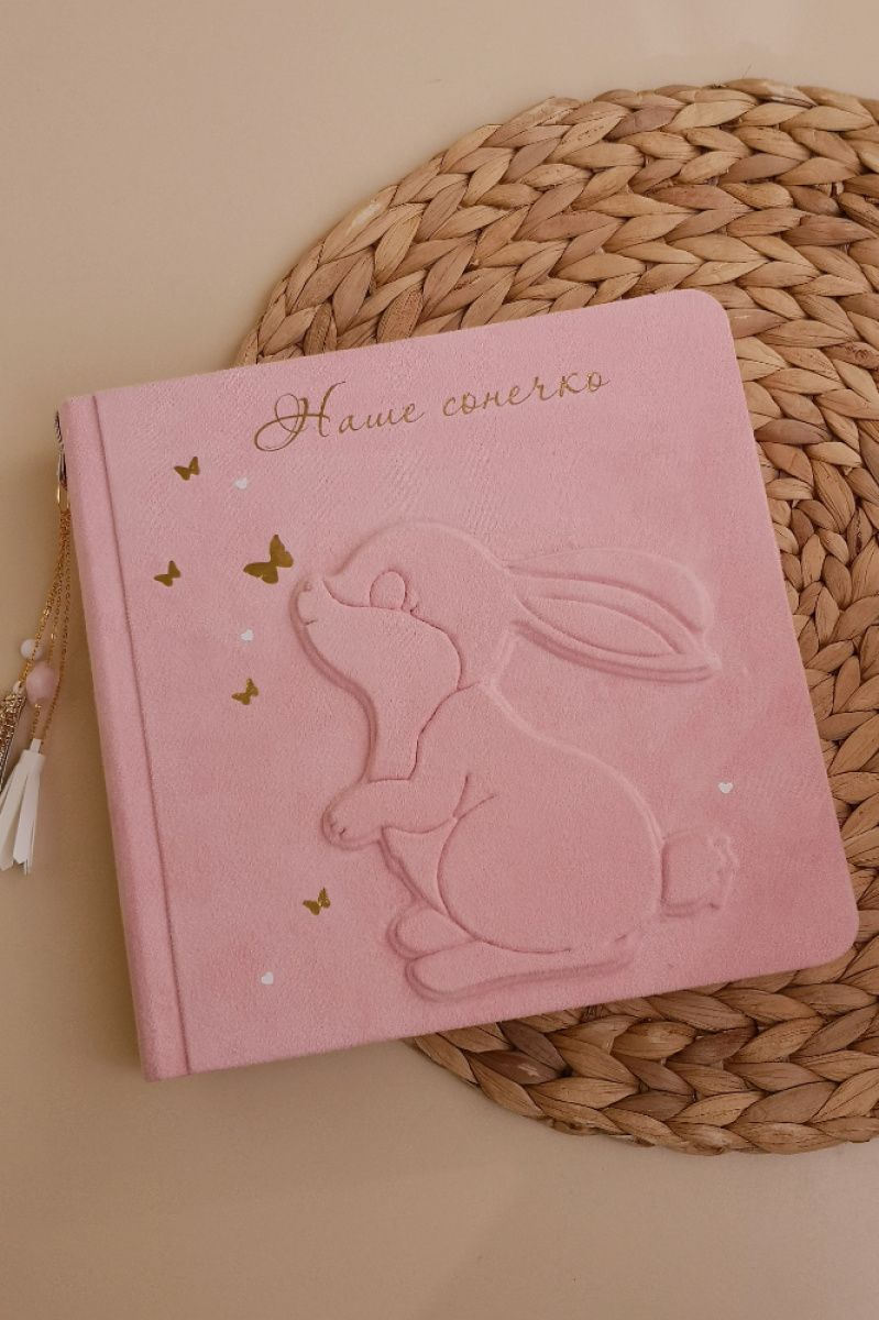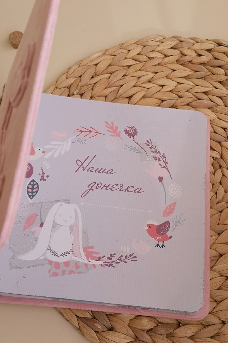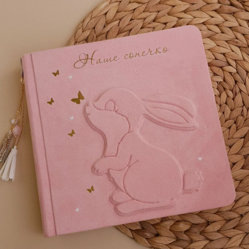 Бебибук "Наше солнышко" Размер 21*21 см.; Внутри 36 листов (72 страницы), плотность бумаги 250 грамм.; Материал обложки – замш; На корешок добавлен кисть с деталями. Клей и пальчиковая краска для отпечатков ручек и ножек уходят в комплектацию к альбому Будет отличным подарком для вас или ваших близких!