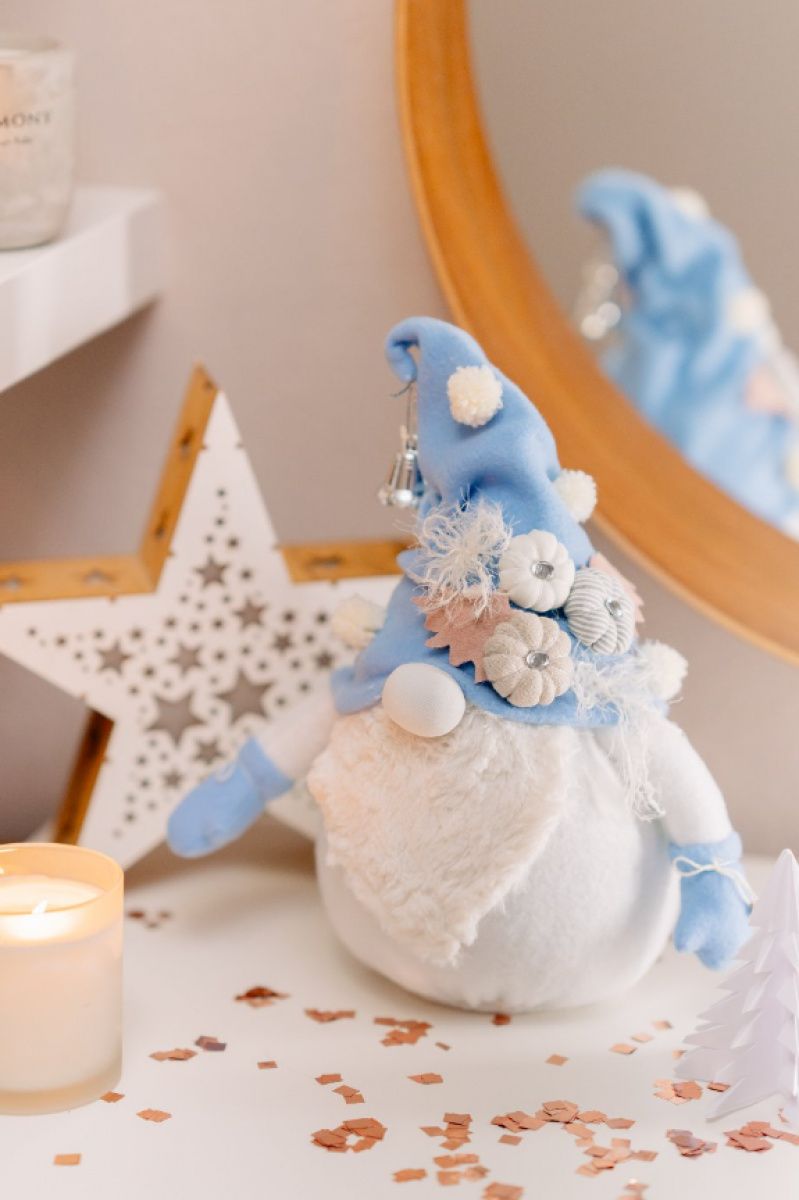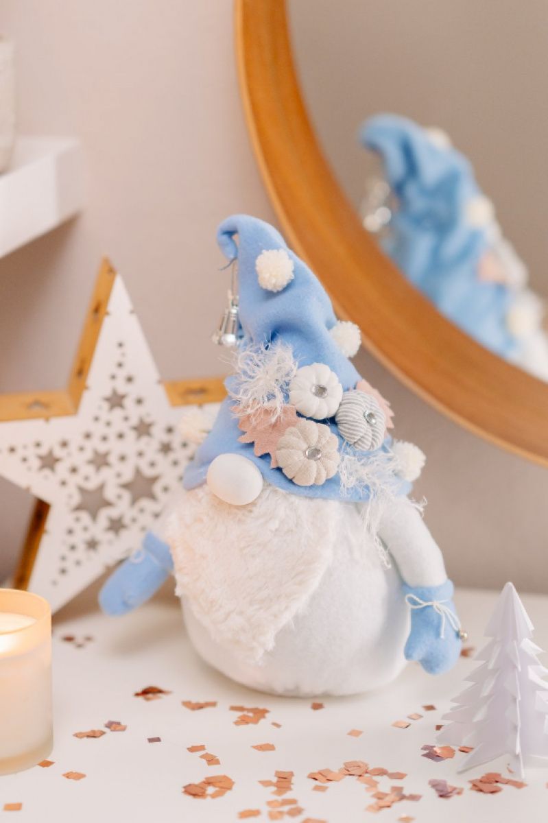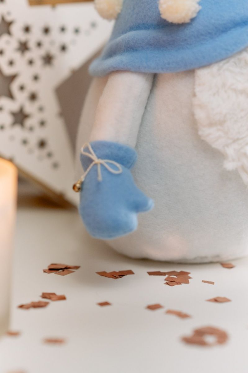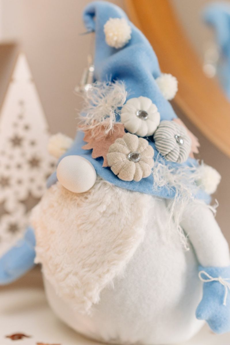 Снеговик в бело-голубых цветах с колокольчиками станет украшением вашего новогоднего интерьера.