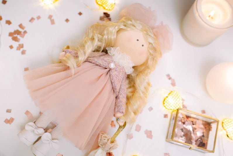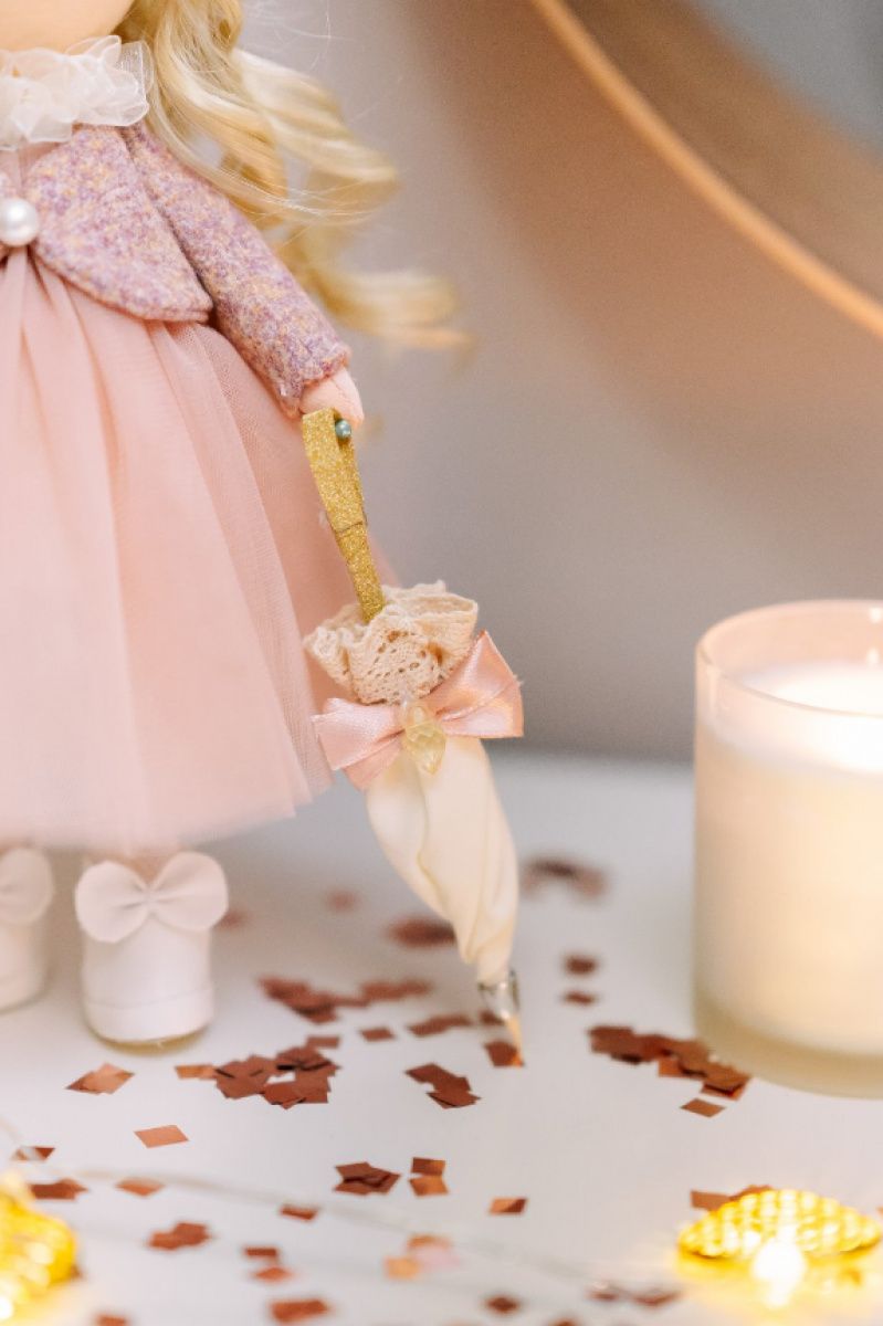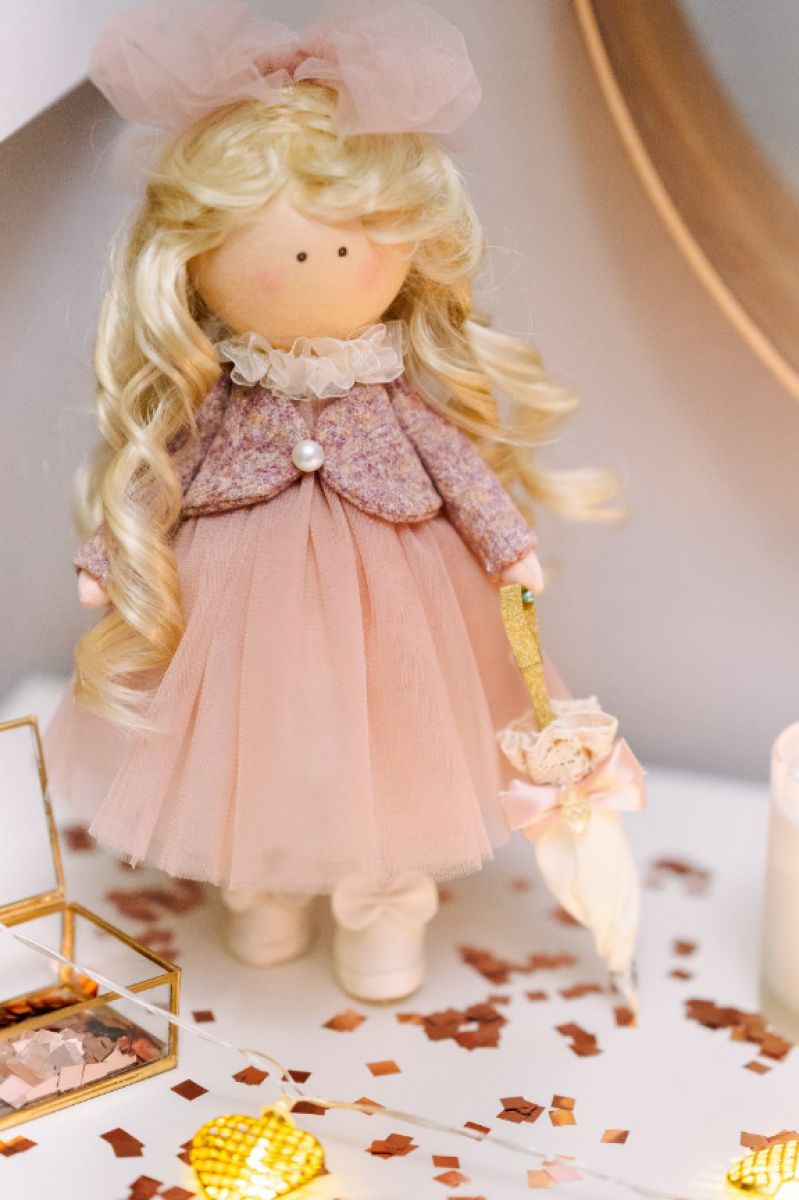 Текстильная кукла в нежных, пудровых оттенках с зонтиком