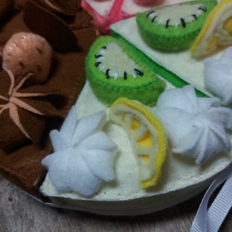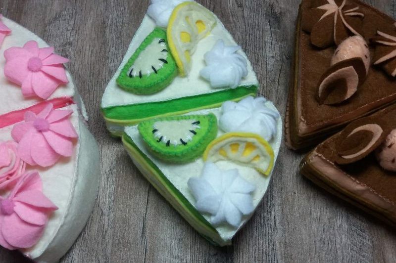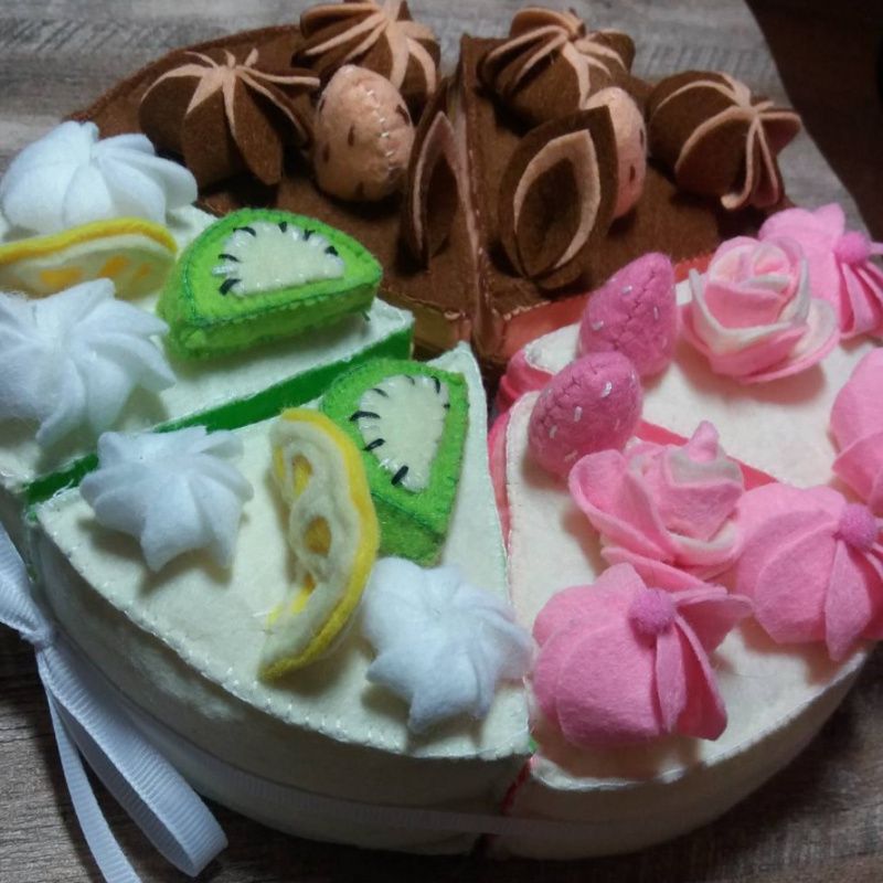Торт из фетра на липучках. Возможен только зефирно-клубничный или киви с лимоном или шоколадный. А также из разных кусочков. Разрезается пластмассовым ножом. Диаметр 20 см.