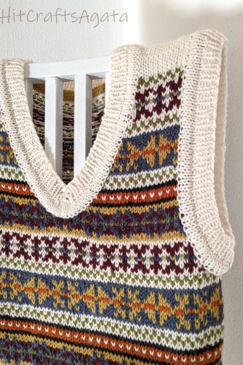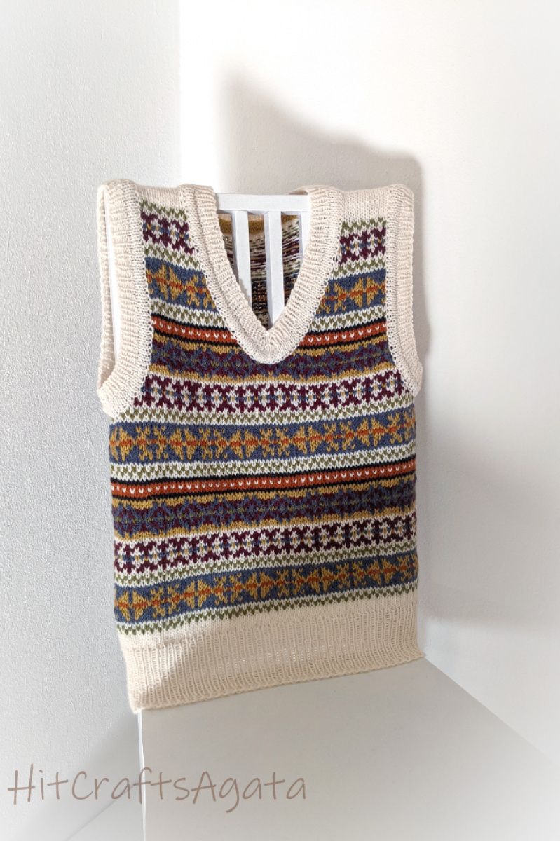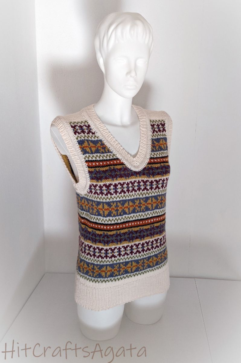 Класичний жилет з орнаментом підійде для кожного, хто цінує вишуканість та стиль. Зв'язаний спицями, по колу, без швів у традиційній ісландській техніці fair isle. Подвійна обробка країв.