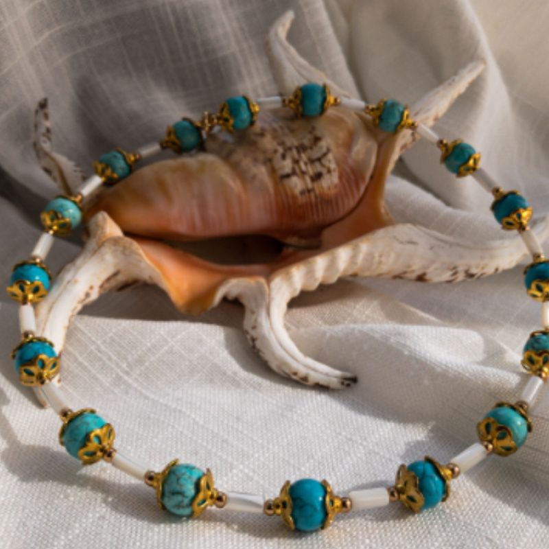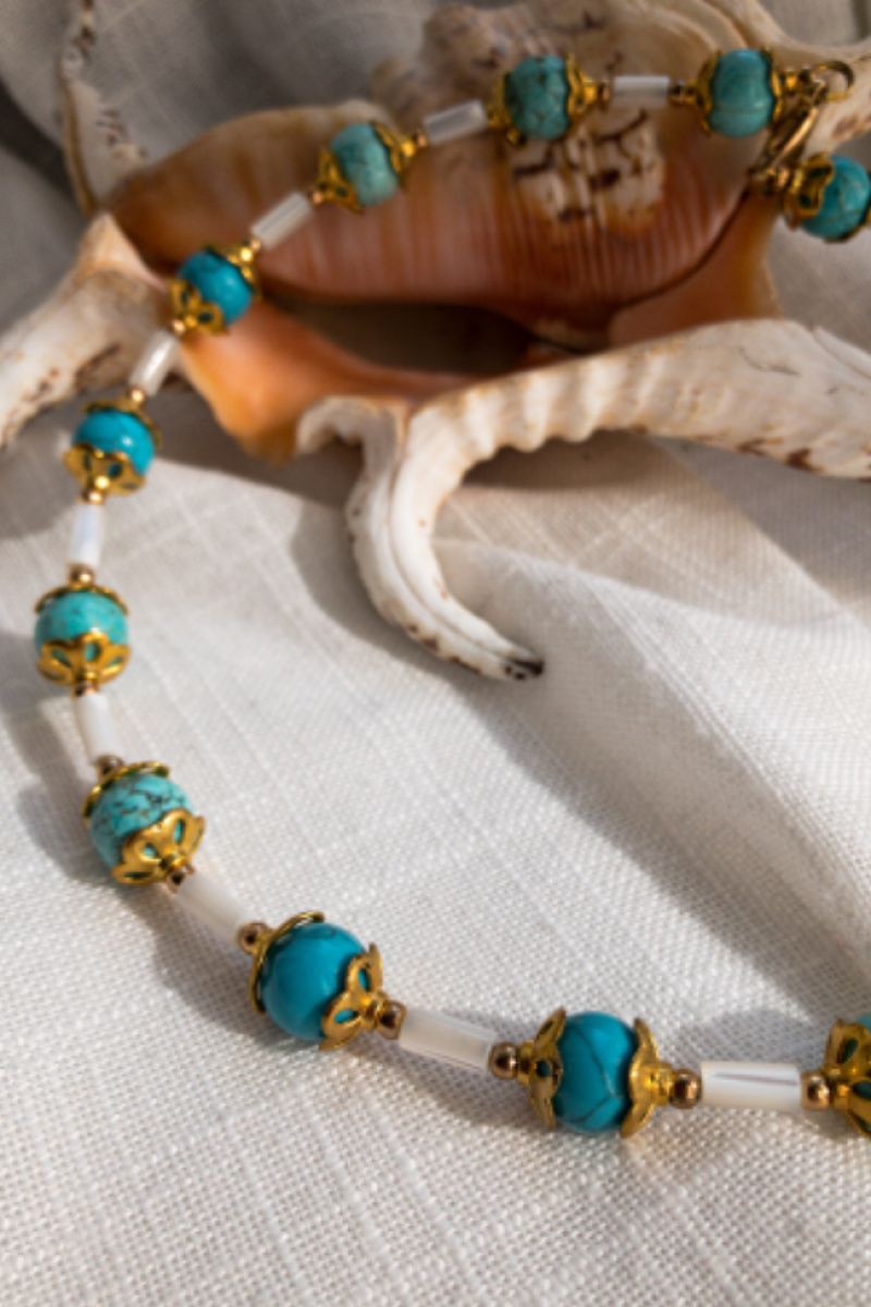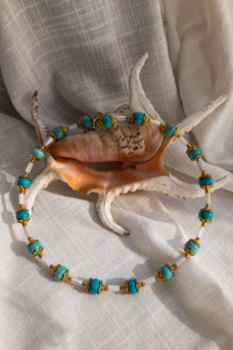 Чокер выполнен из натуральных перламутра и бирюзы.
