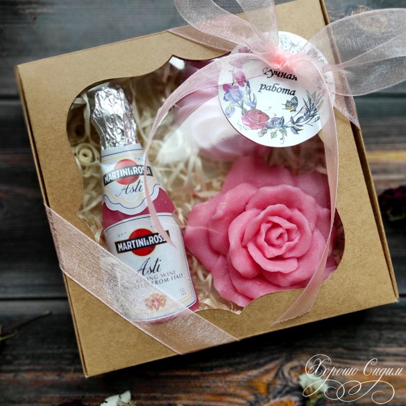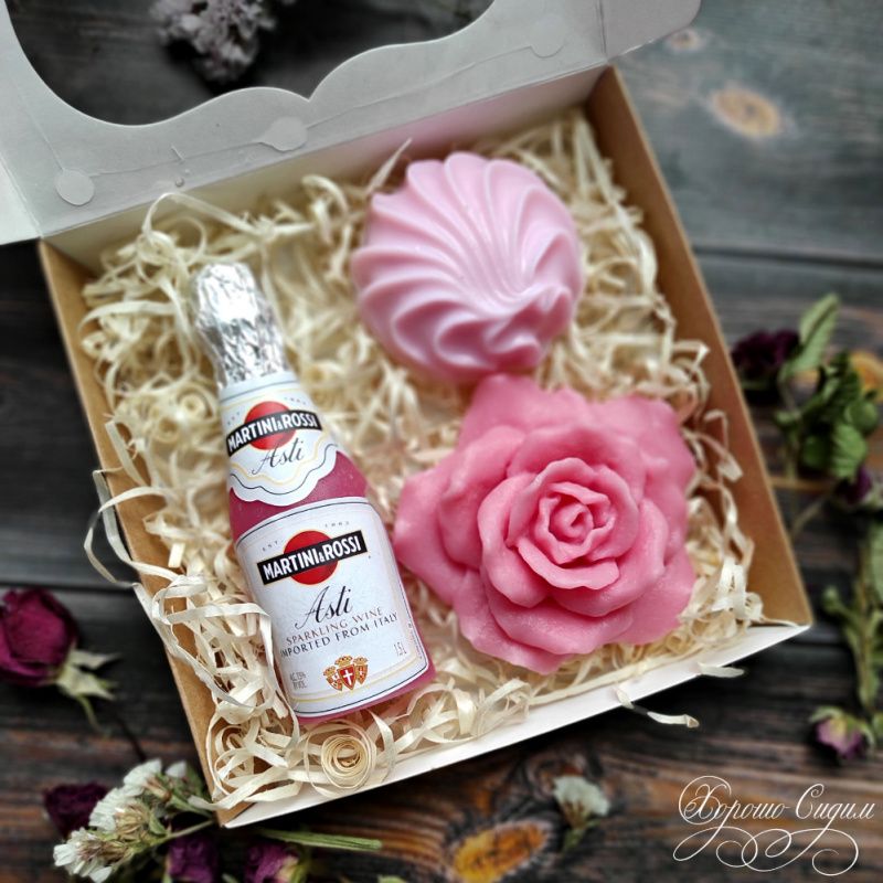 Подарочный набор мыла в виде приятных праздничных атрибутов — бутылочки шампанского, ароматной розы и зефирки. Это необычным и оригинальным подарком для друзей и близких. Мыло изготовлено из натуральных компонентов и потому оно бережно очищает кожу, смягчает и питает. Набор красиво упакован в коробочку с прозрачным окошком и потому даже без распаковки такой подарок поднимает настроение.