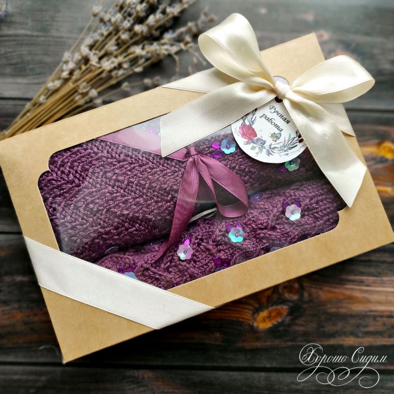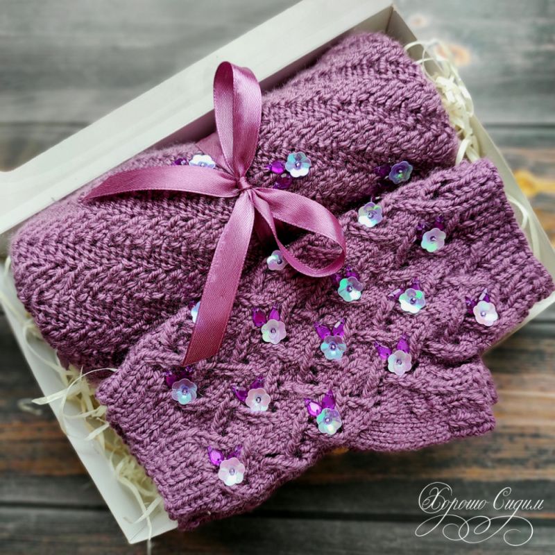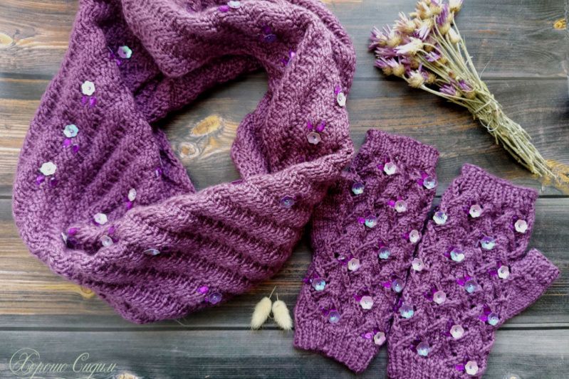 Мягкий и красивый набор из снуда и митенок. Изделия связаны и расшиты вручную.