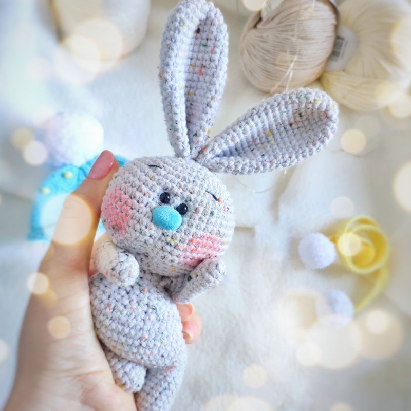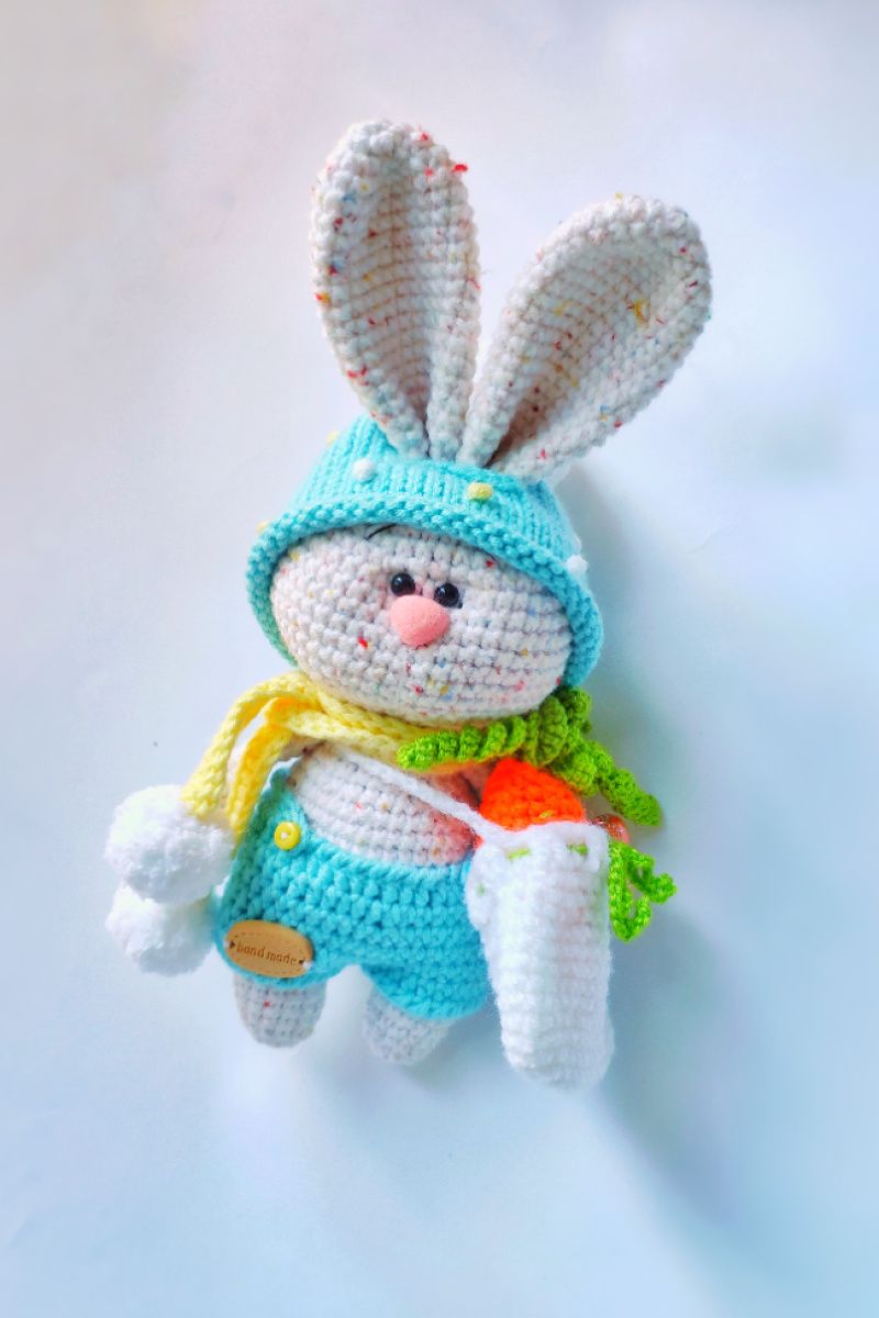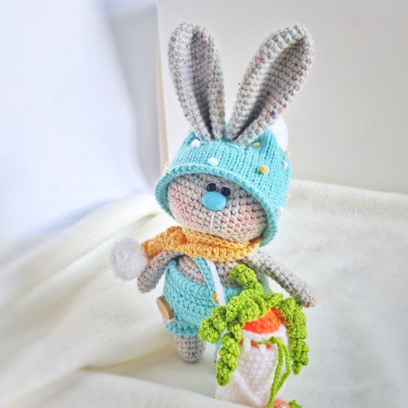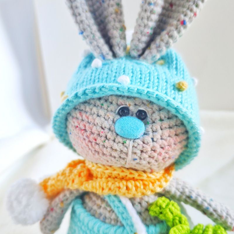 Зайчик Пухлые щёчки в костюме с шапкой, с морковкой и сумочкой.В очень тёплом шарфике с помпонами
