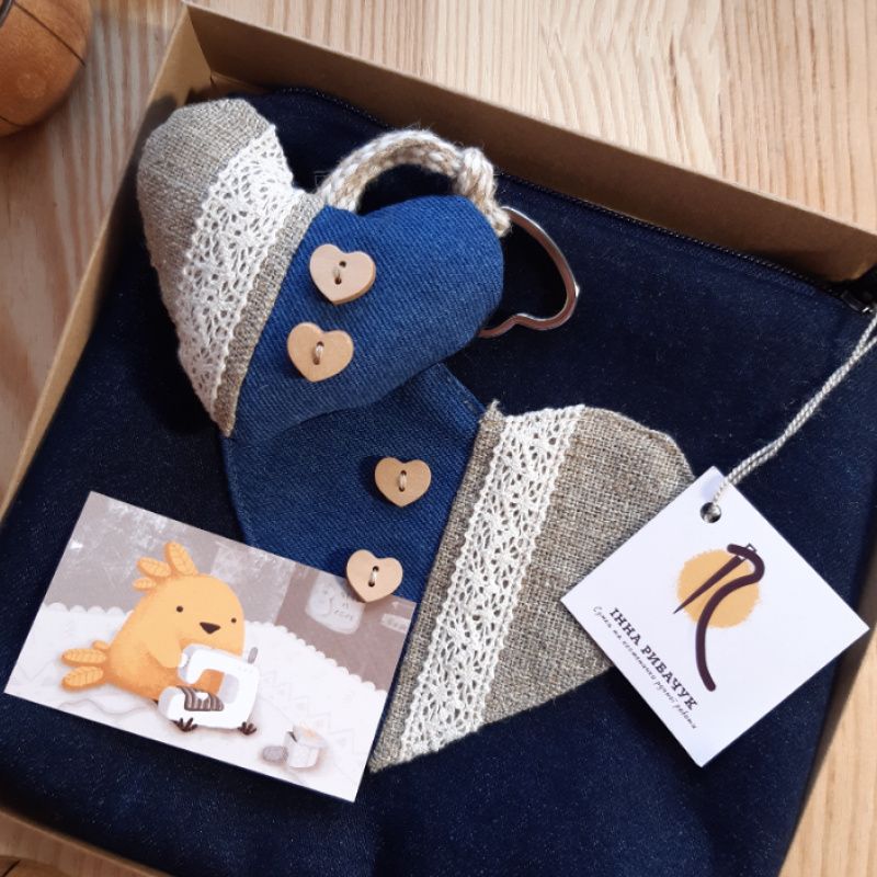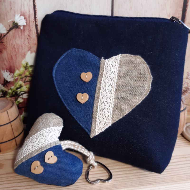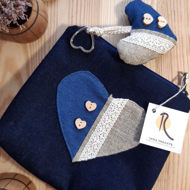Комплект -косметичка и брелок-создаст хорошее настроение или станет хорошим подарком. Сшитые из плотной джинсовой ткани темно-синего цвета. Декор на косметичке-сердце с голубого джинса, рогожки, хлопкового кружева и деревянных пуговиц. Брелок сшит в том же стиле, что и косметичка. Размер косметички 22 × 20 см, застежка-магнитная кнопка.