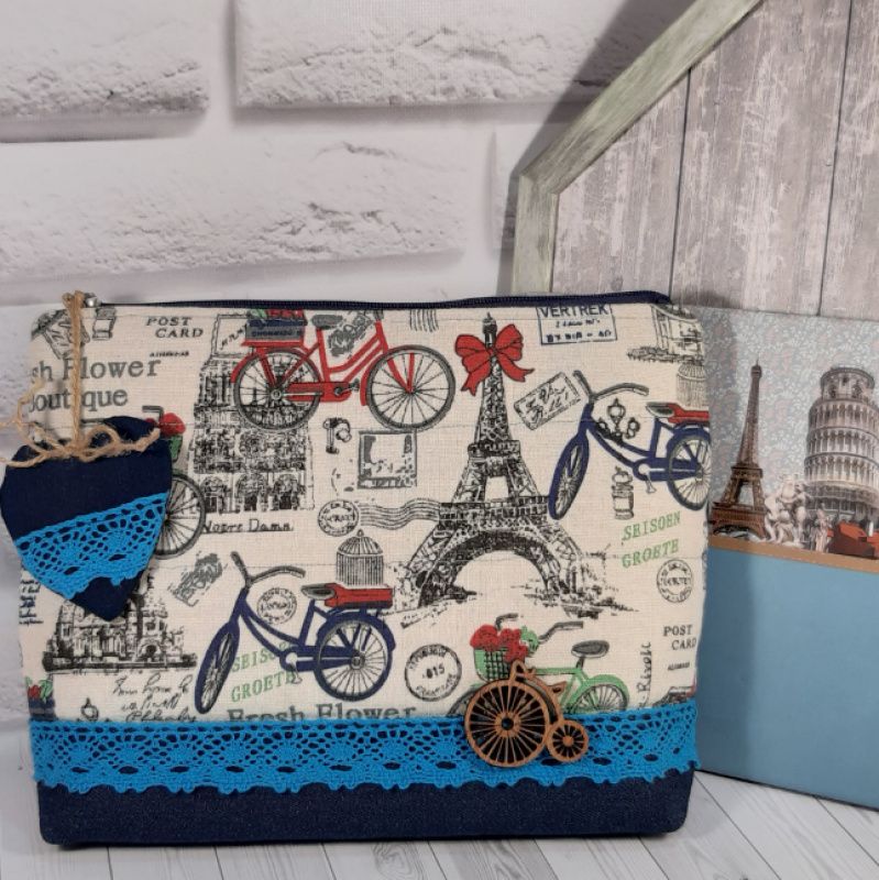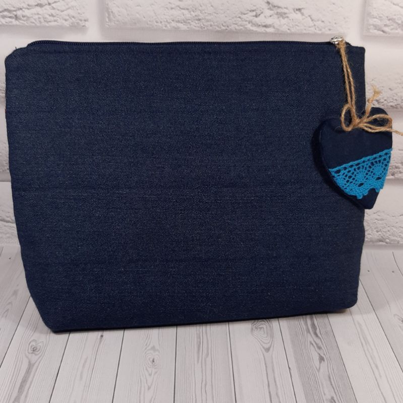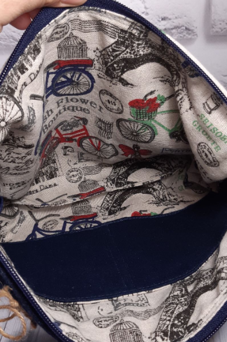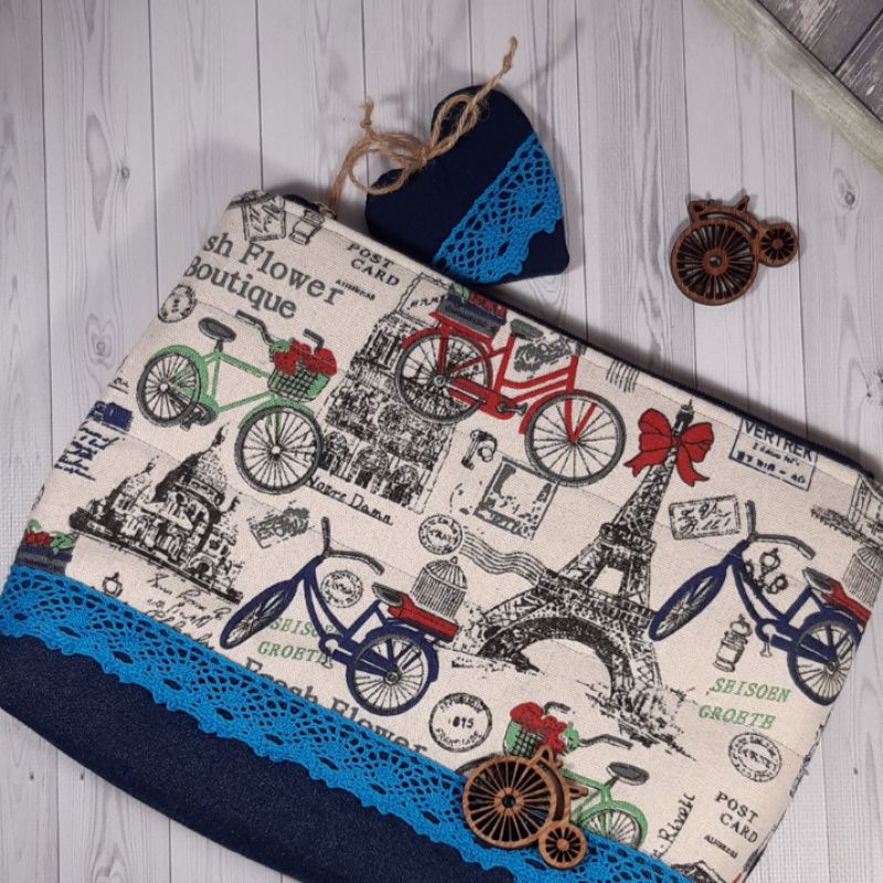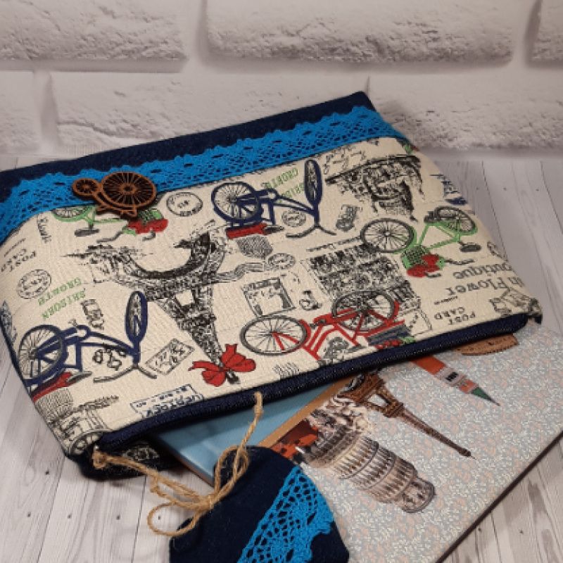Вместительная косметичка сшита из джинсовой ткани и льна. Простеганная, хорошо держит форму. Декор хлопковое кружево, деревянный маленький велосипед, подвеска-сердце (снимается). Застежка -блискавка, две внутренние накладные карманы. Размер-32 × 25 см. Косметичка достаточно большая, подойдет для хранения различных вещей, а также незаменима в путешествии. Хороший вариант для подарка.